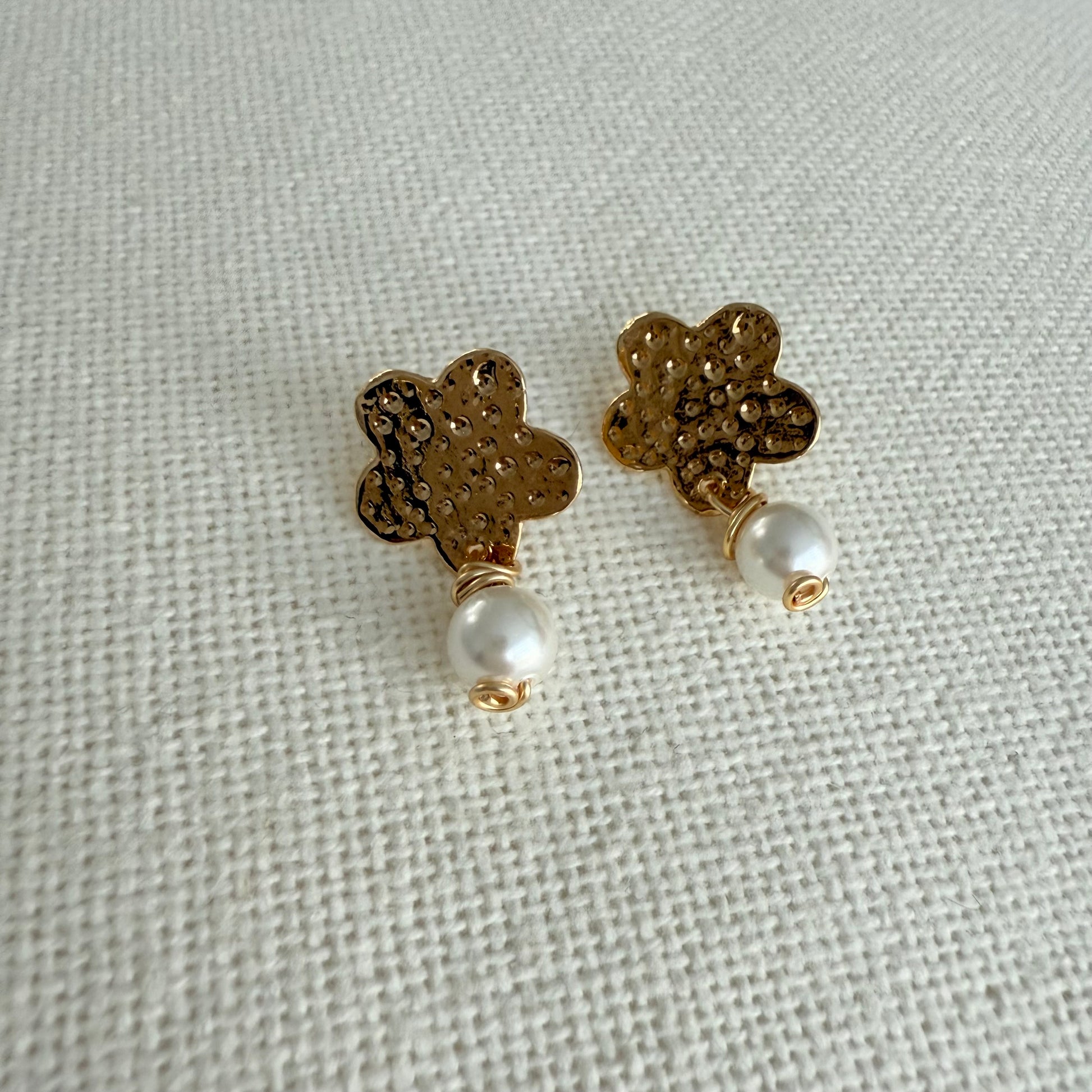 Ces boucles d'oreilles artisanales plaquées or 24 carats présentent des clous d'oreilles floraux finement sculptés d'où pendent gracieusement des perles torsadées à la main.
