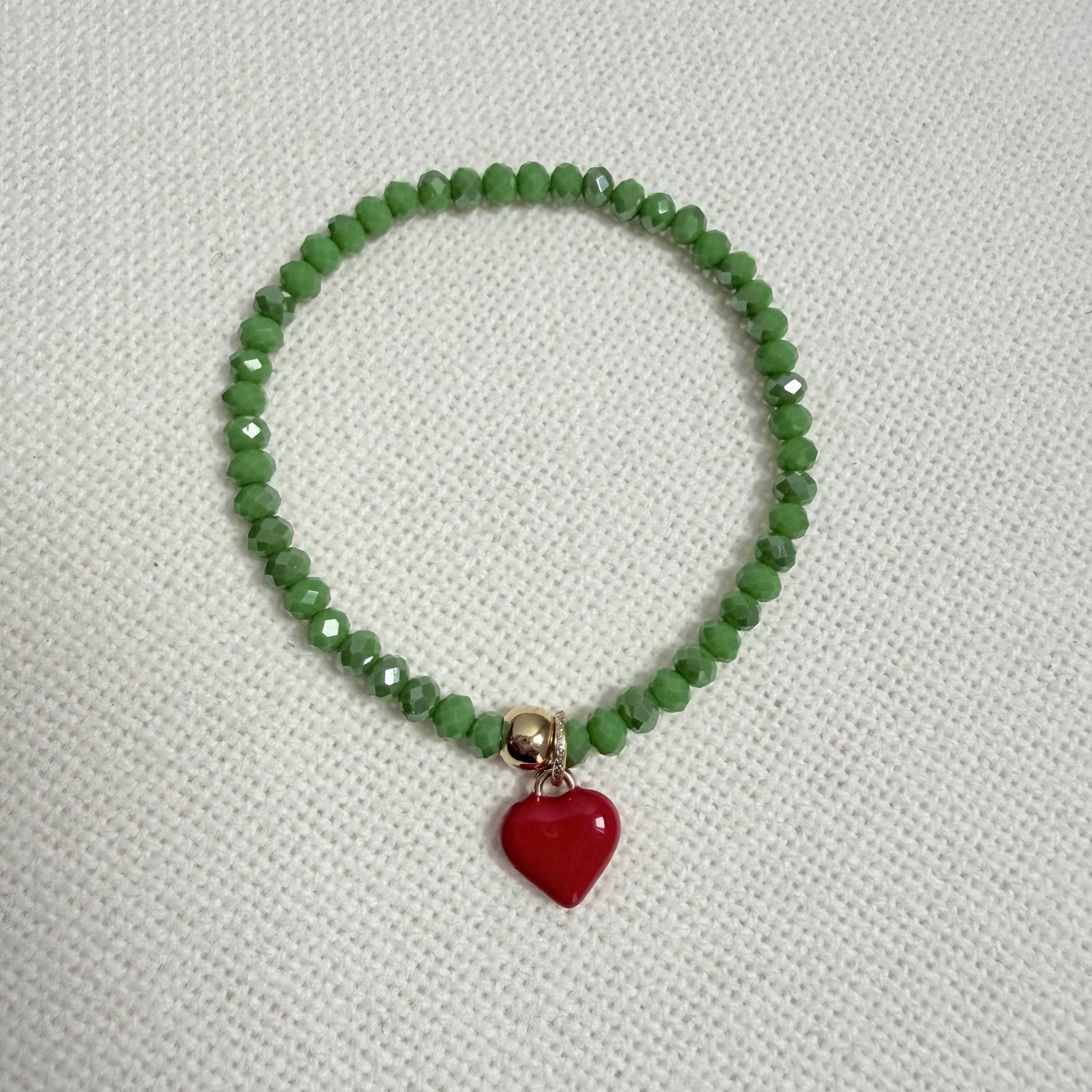 Un bracelet romantique fait main, orné de cristaux de verre de Murano verts de 4 mm et d'un délicat pendentif en forme de cœur rouge symbolisant l'amour et la tendresse.