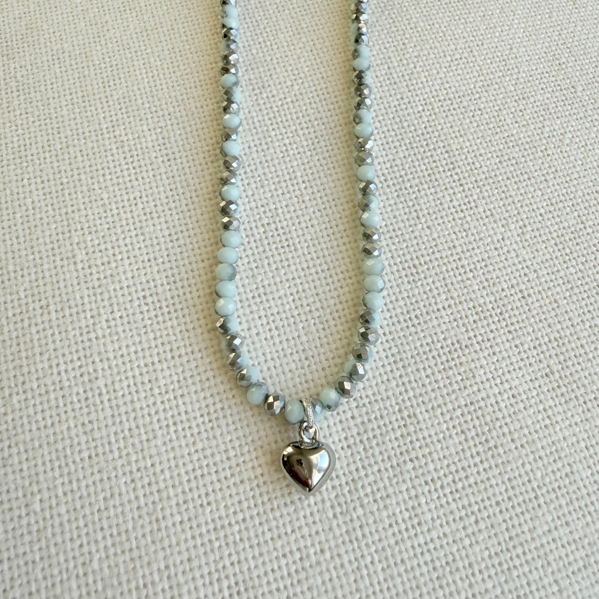 Brillez subtilement avec ce collier unique, fabriqué à la main, orné de cristaux de Murano étincelants, de détails argentés et d'un adorable pendentif en forme de cœur.