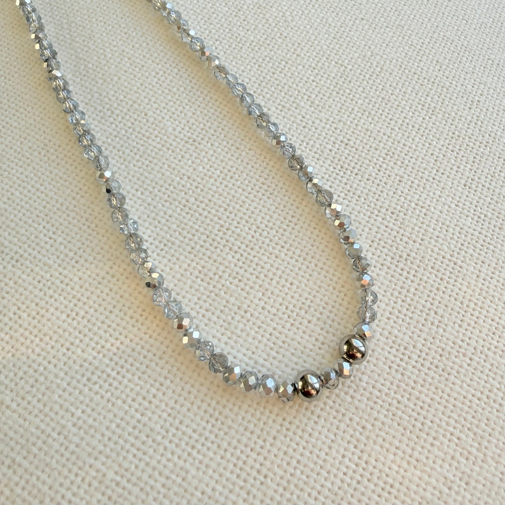Brillez avec subtilité grâce à ce collier unique, confectionné à la main et orné de cristaux argentés étincelants et de délicats détails argentés. Idéal pour ajouter une touche d'élégance et de brillance discrète à toutes vos tenues.