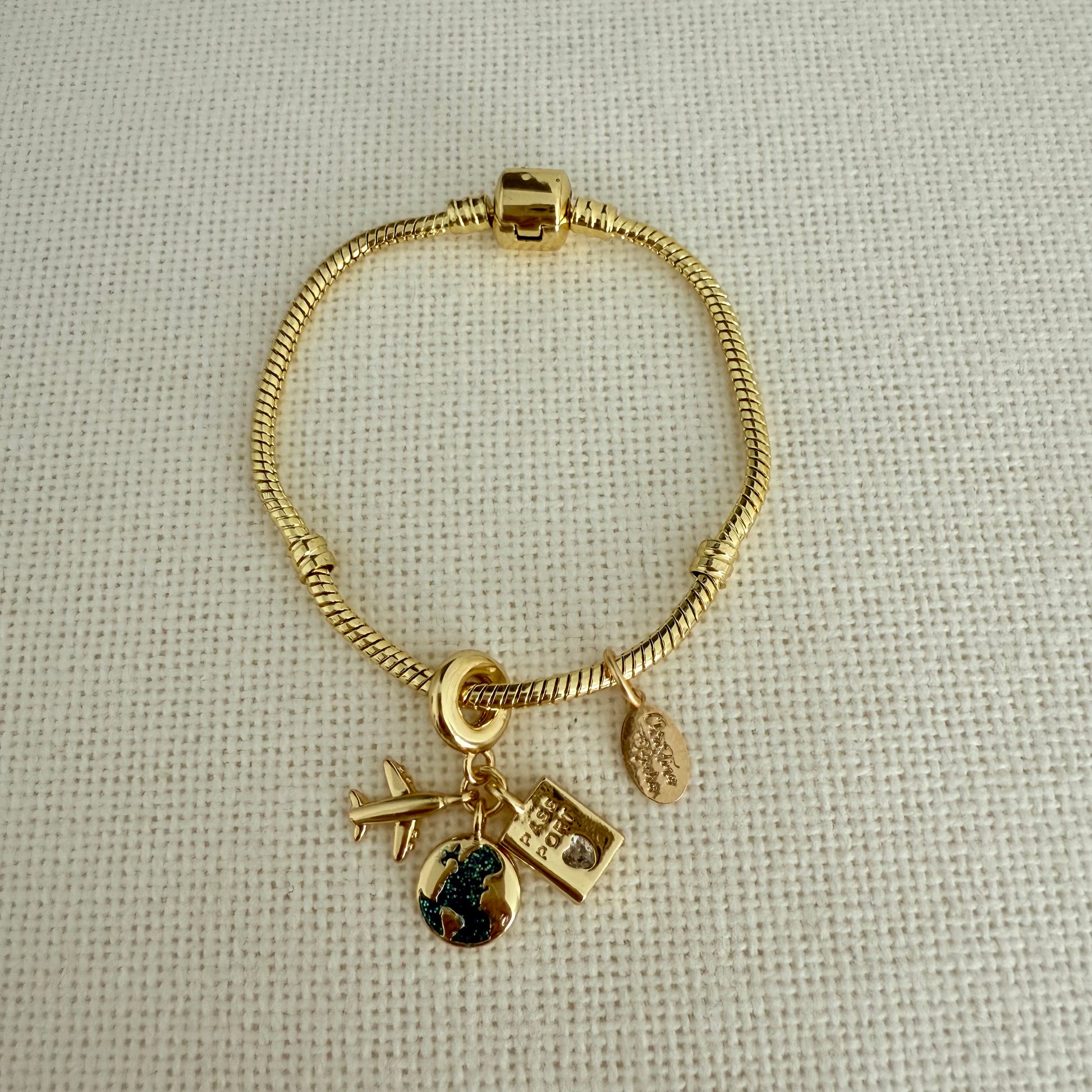 Ce charmant bracelet, inspiré du voyage, présente un design délicat plaqué or 24 carats orné de trois breloques symboliques : un globe terrestre, un passeport et un avion. Chaque breloque célèbre l’esprit d’aventure et la joie de découvrir le monde.