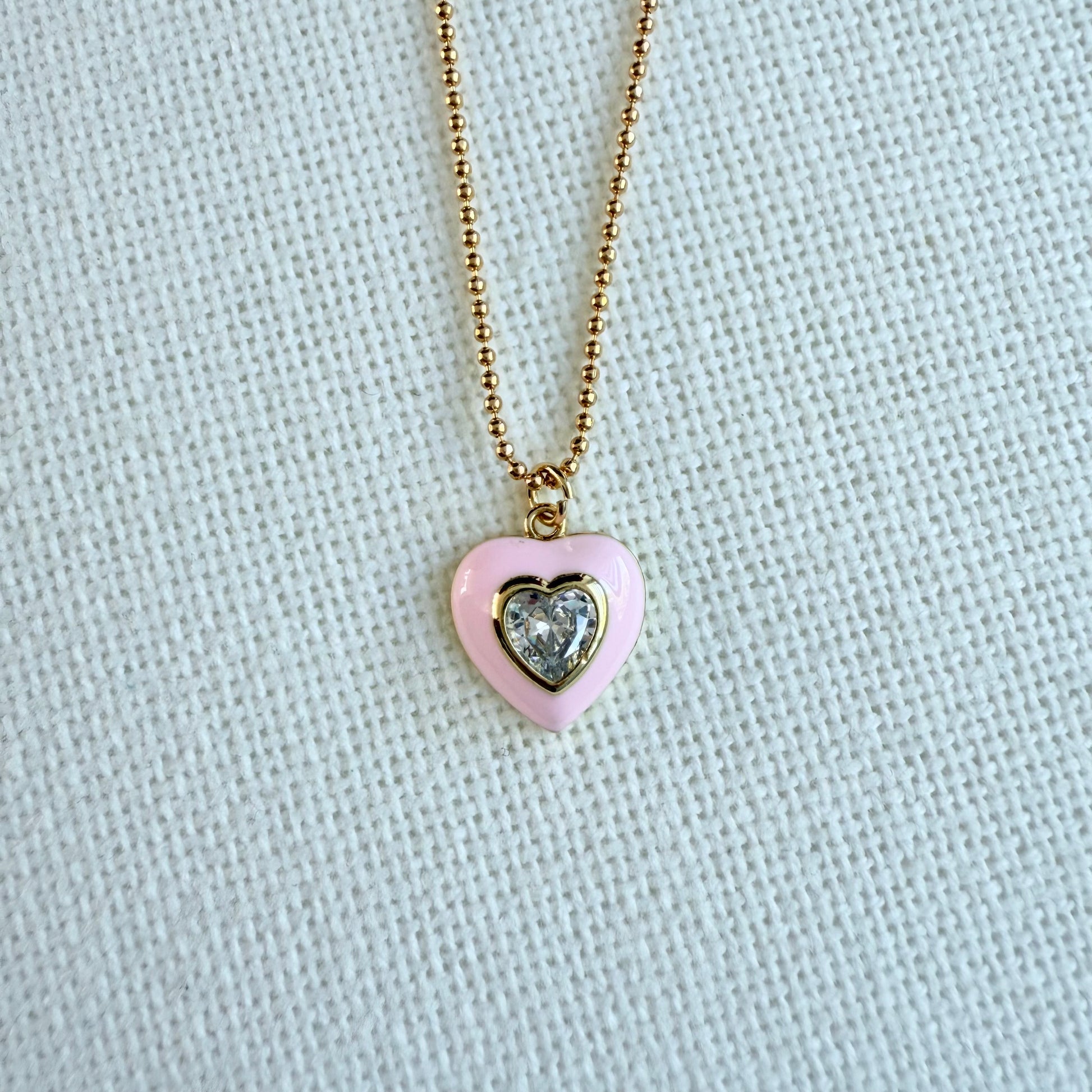 This beautiful design features a light pink heart with a sparkling crystal heart in the center, adding a touch of elegance and charm to your everyday style. The chain is made of 14K gold filled, offering durability and a lovely shine. Perfect for those who adore feminine and meaningful accessories.