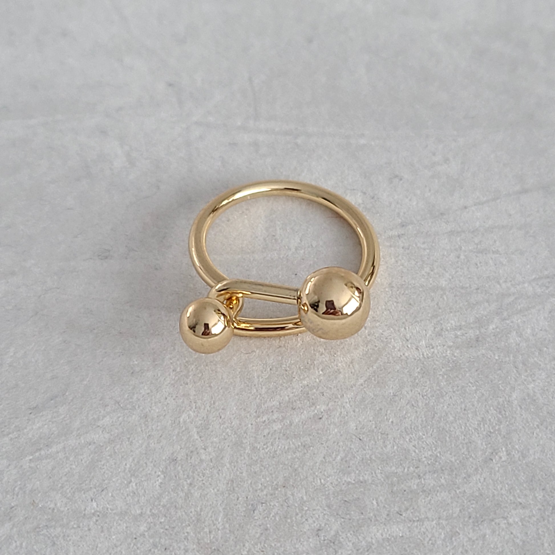 This elegant ring features a refined crossover design, accented with two polished gold beads at each tip. Made in gold-finish rhodium, it's adjustable, hypoallergenic, and designed for effortless everyday elegance.