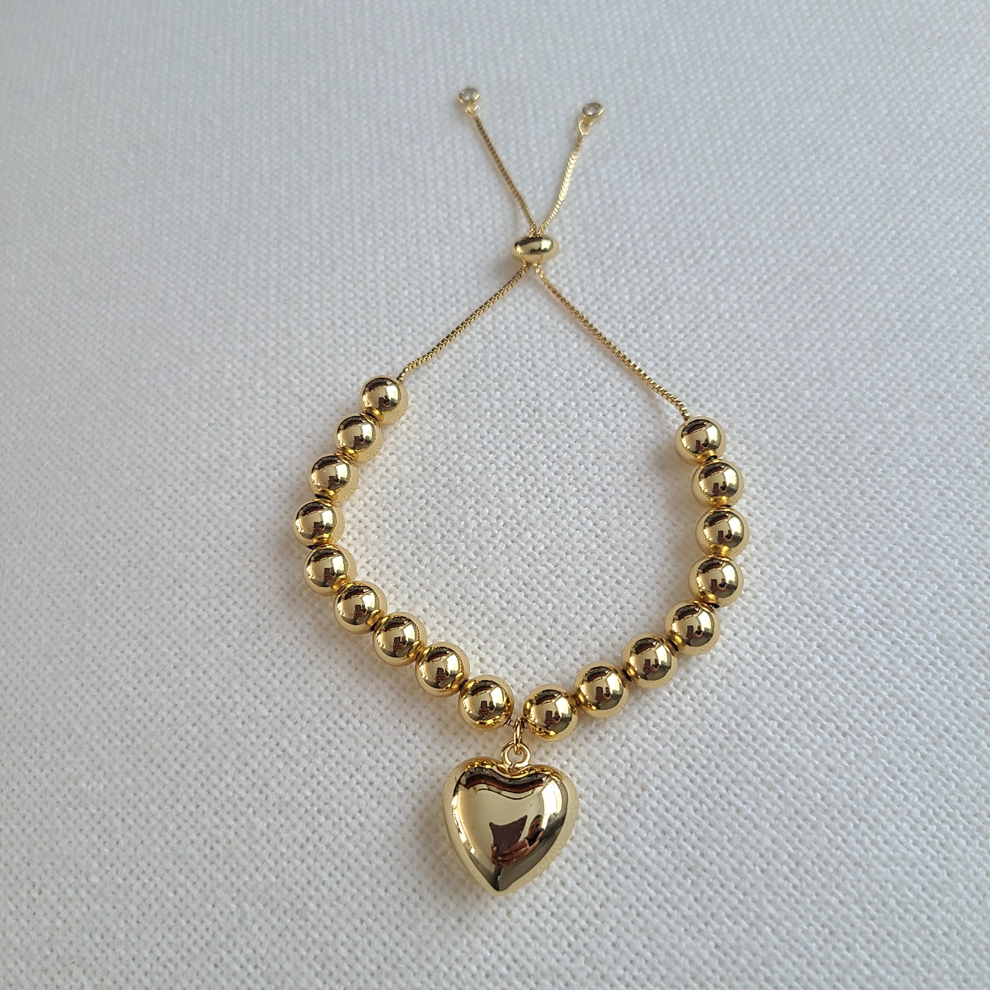 This elegant adjustable bracelet is crafted with 14k gold-filled beads and features a beautiful heart charm at its center — a timeless symbol of love and connection. Delicate yet full of meaning, it's perfect for layering or wearing on its own.