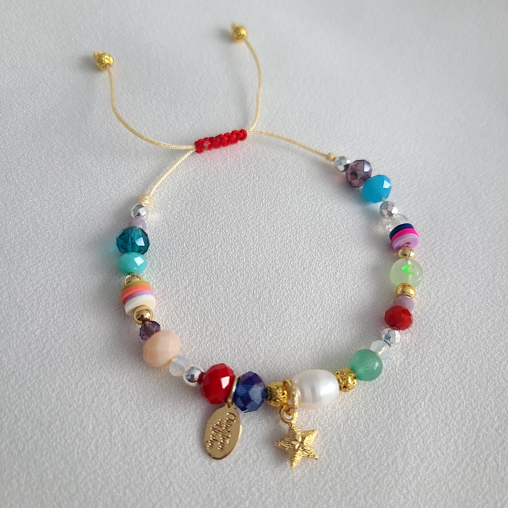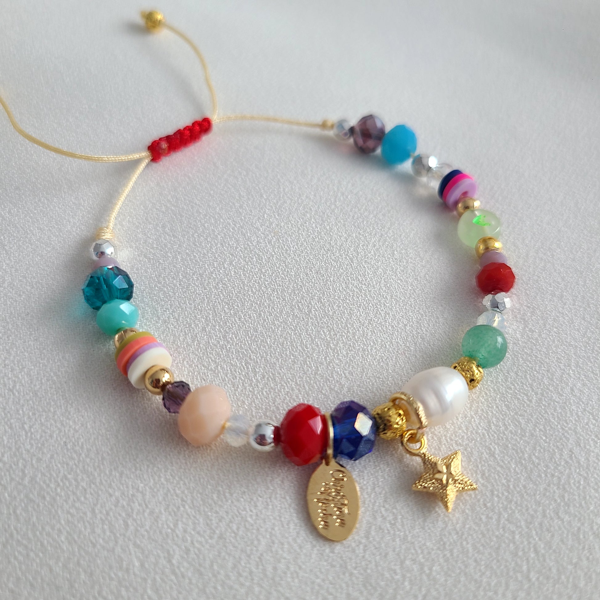 A one-of-a-kind, adjustable bracelet handcrafted with natural stones, a freshwater pearl, and delicate charms. A unique piece designed to highlight the beauty found in small details.