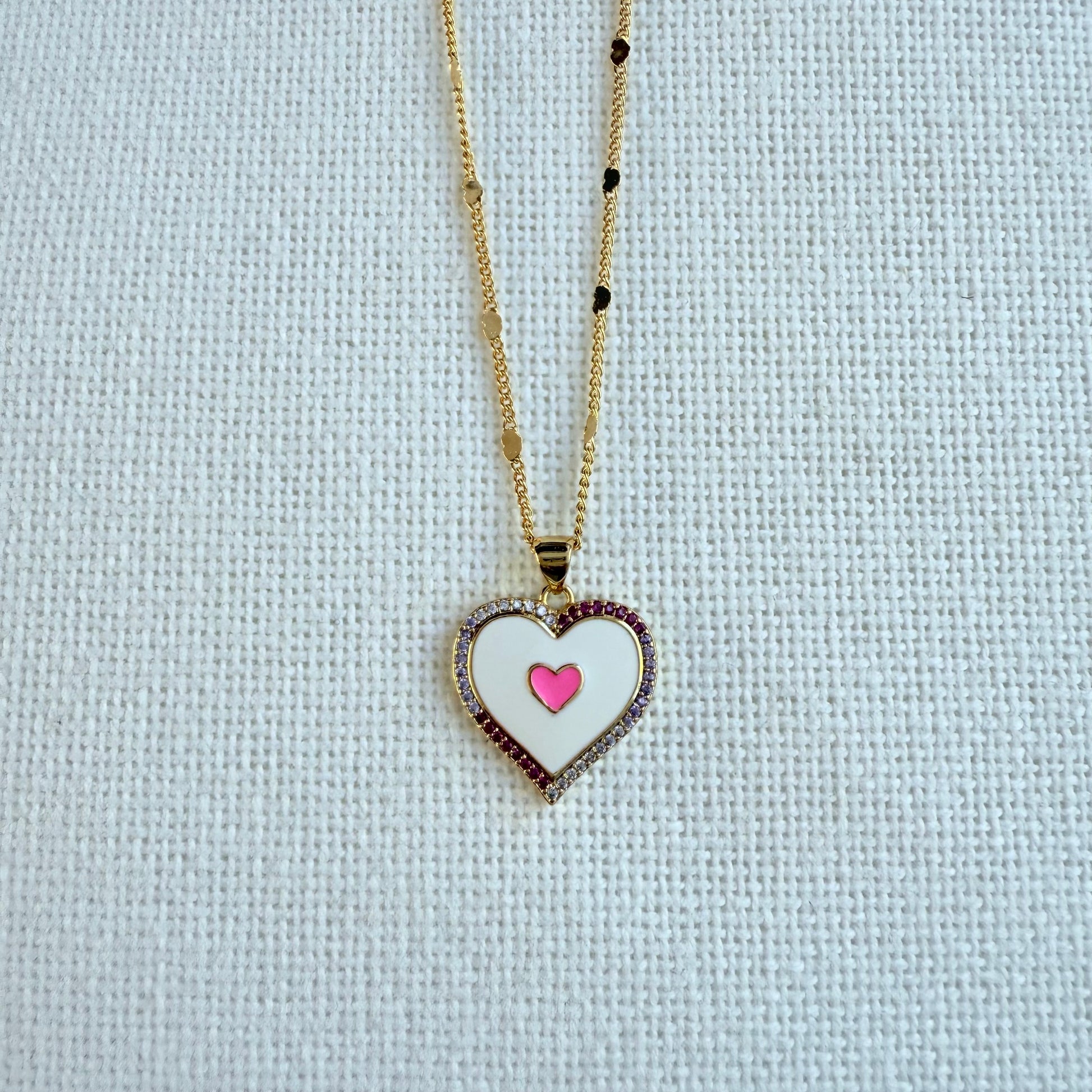 Delicate and feminine, this 14K gold filled necklace features a solid white heart-shaped pendant, gracefully surrounded by tiny shimmering crystals. At its center, a small blush pink heart adds a soft, romantic detail that makes the piece feel truly special.