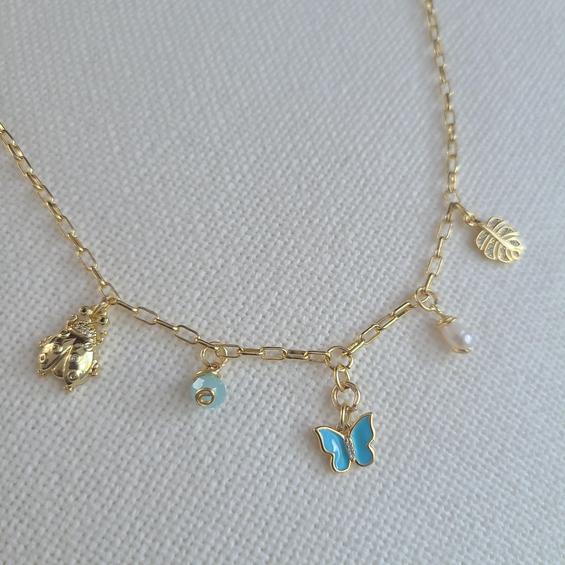 This delicate 14k gold-filled necklace is adorned with a charming selection of pendants: a soft blue butterfly, a graceful leaf, a sweet little ladybug, a freshwater pearl, and a sparkling blue crystal. Each element evokes the beauty of nature and adds a whimsical, elegant touch to this unique piece.