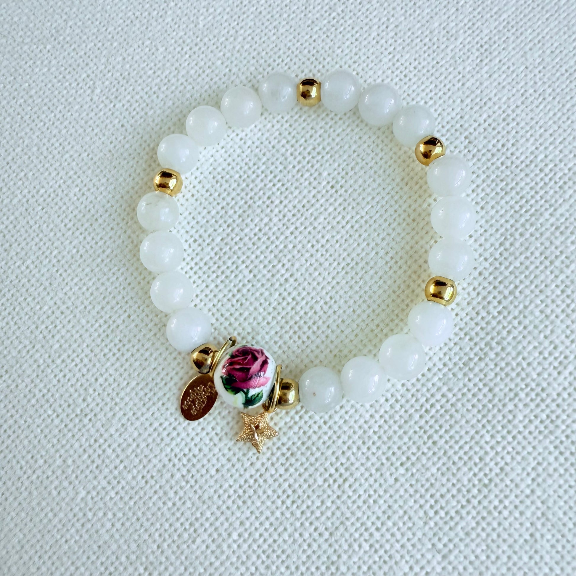 A refined bracelet crafted with luminous white Jade gemstones and 14K gold-filled accents. At its center shines a decorative floral stone, symbolizing grace and renewal, while a delicate star charm adds a personal and poetic touch. A timeless piece designed to radiate elegance and meaning.