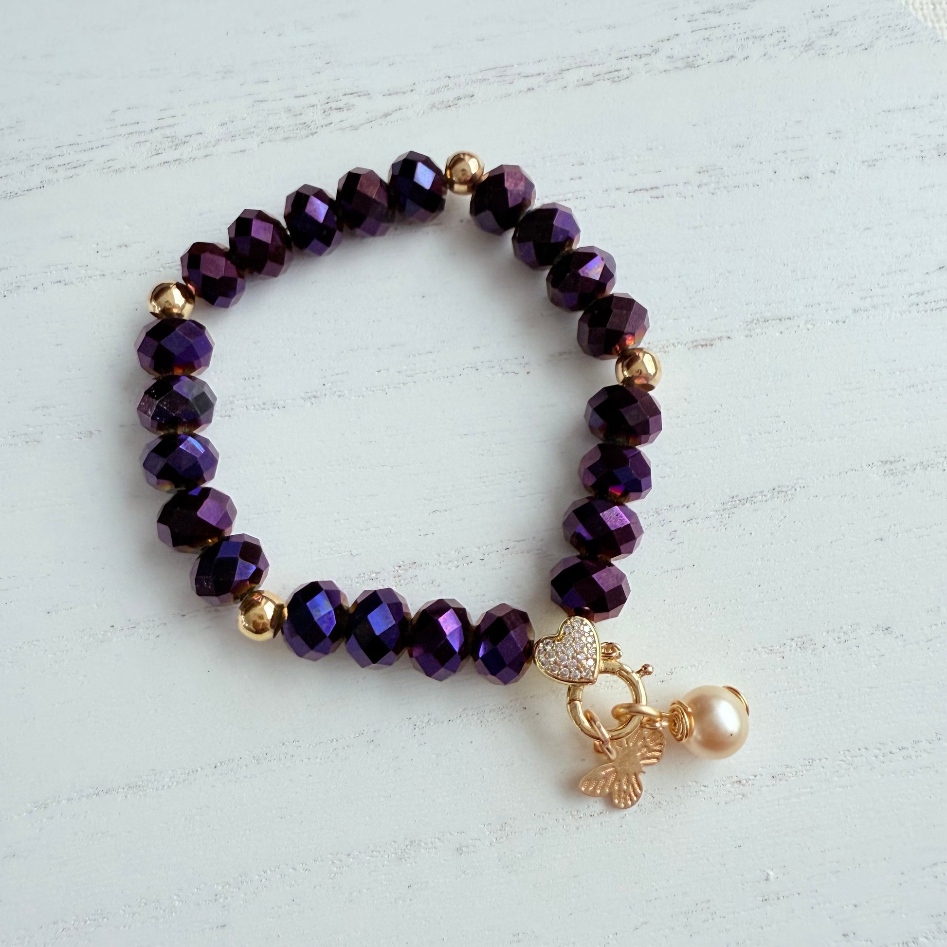 A charming and delicate bracelet crafted with violet Murano crystals and 14K gold-filled accents. At its center, a graceful heart detail holds two dangling charms—a butterfly and a luminous pearl—adding a touch of elegance and whimsy. Perfect for bringing a refined sparkle to everyday wear or special occasions.