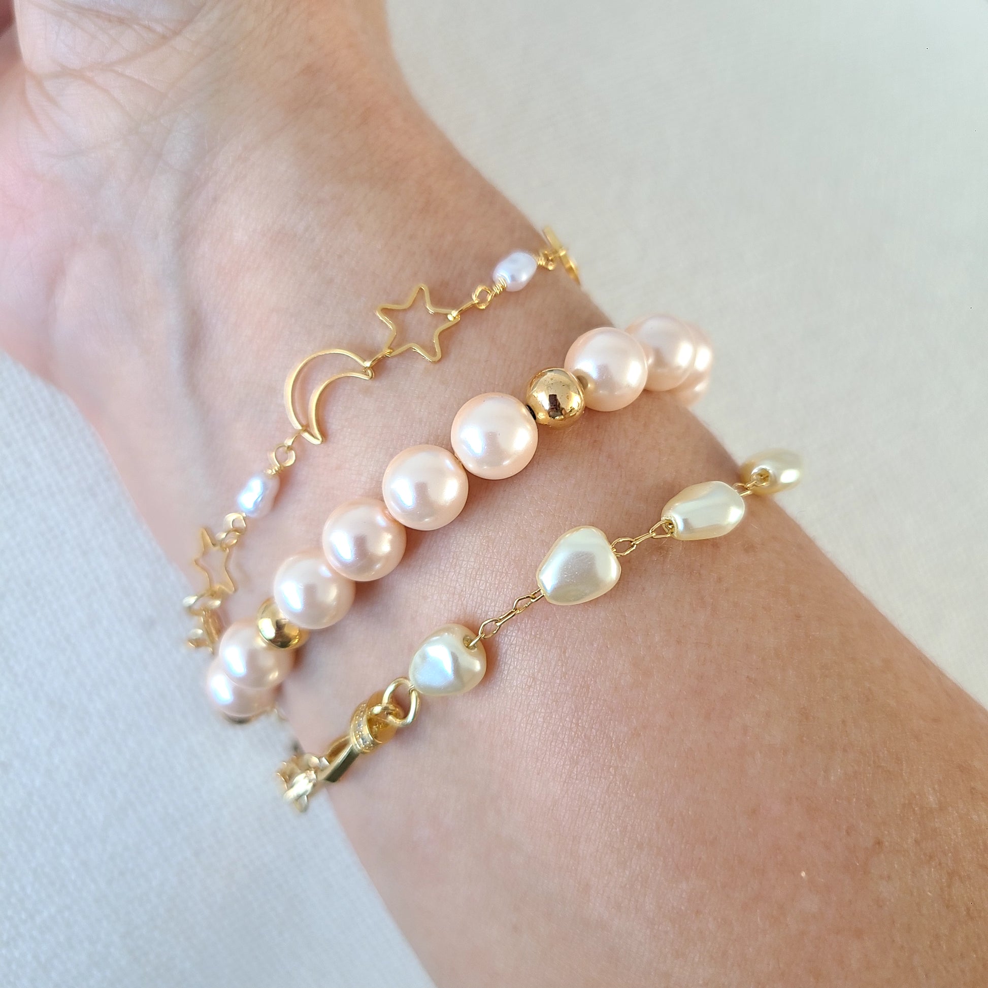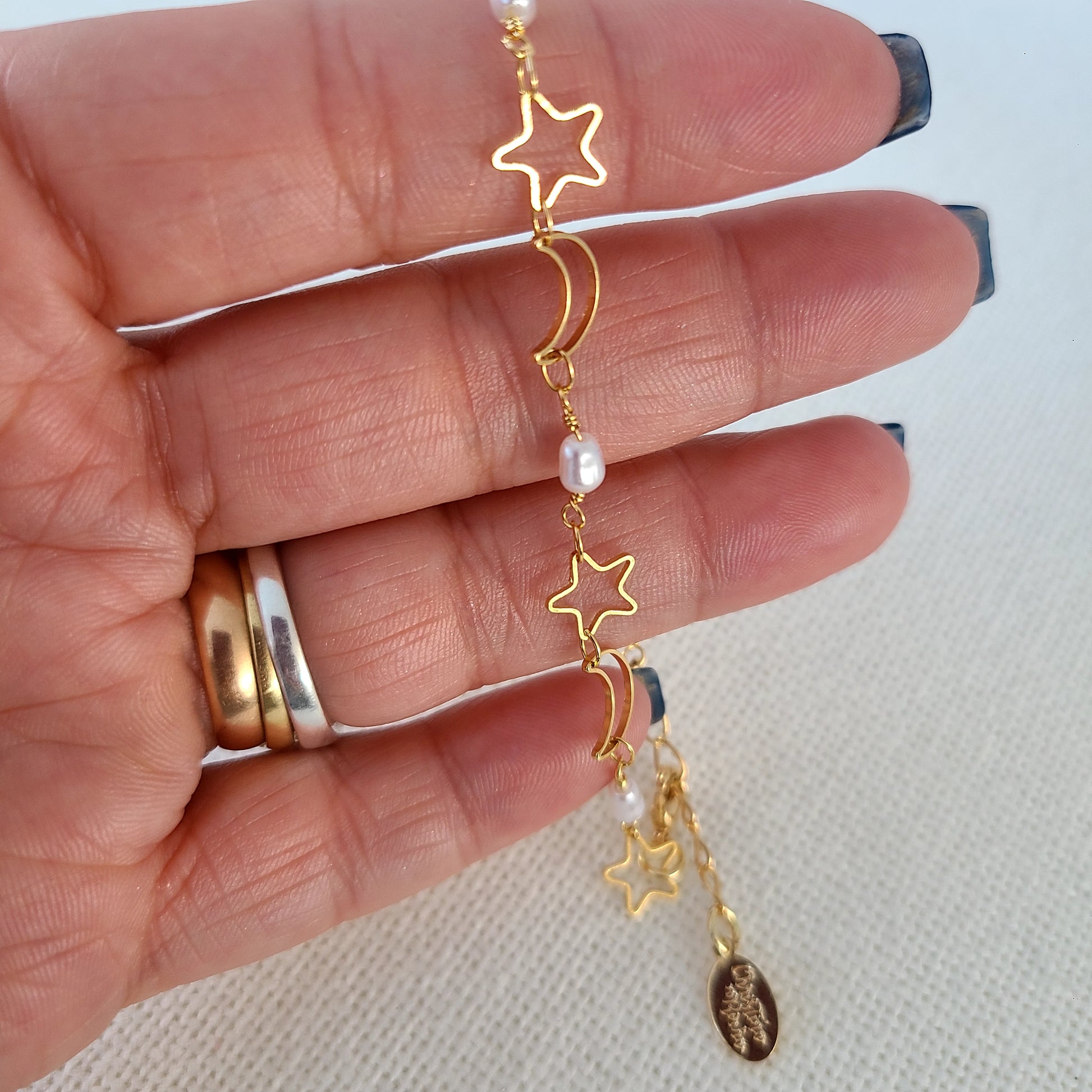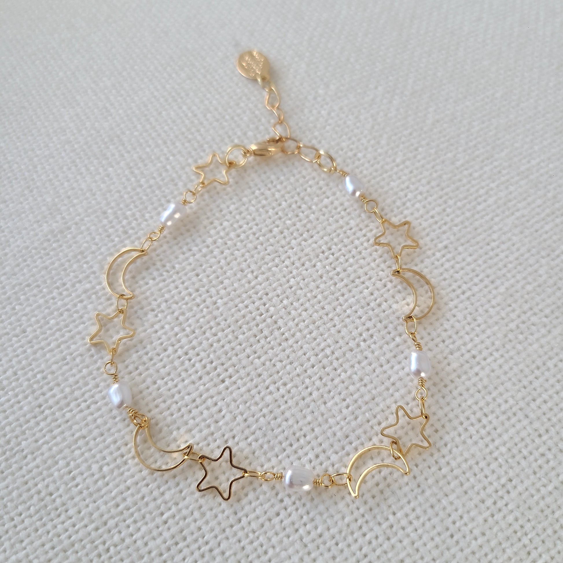 Ce bracelet chaîne en or rempli 14 carats est orné de minuscules étoiles, lunes et perles naturelles, formant une constellation subtile qui scintille à chaque mouvement. Son design célèbre la magie de l'univers et la beauté des moindres détails.