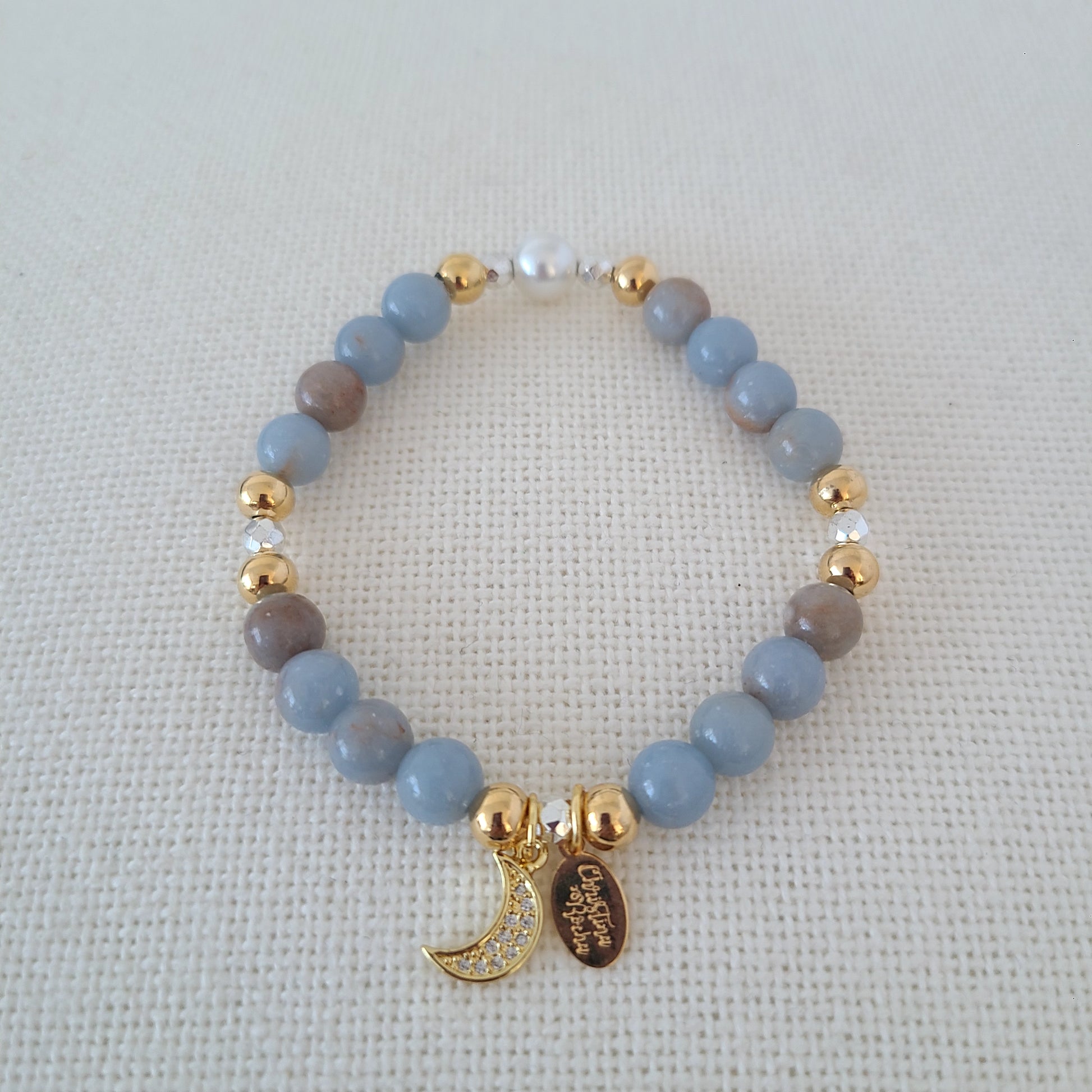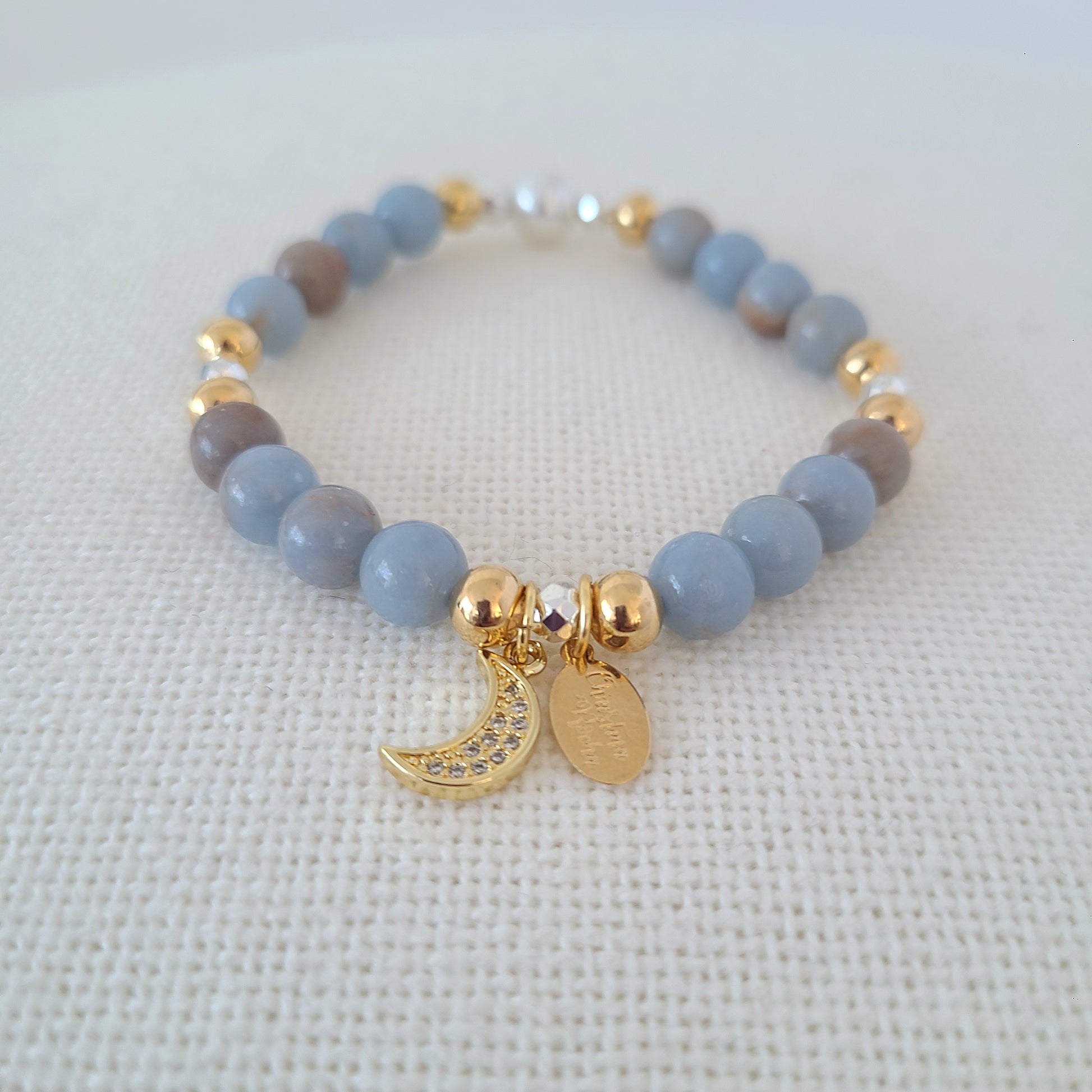 Ce magnifique bracelet unique et délicat est fabriqué à la main avec des pierres précieuses en jaspe bleu et gris de 8 mm, une nacre et des perles remplies d'or 14 carats. Le bracelet est orné d'une magnifique breloque en forme de lune.