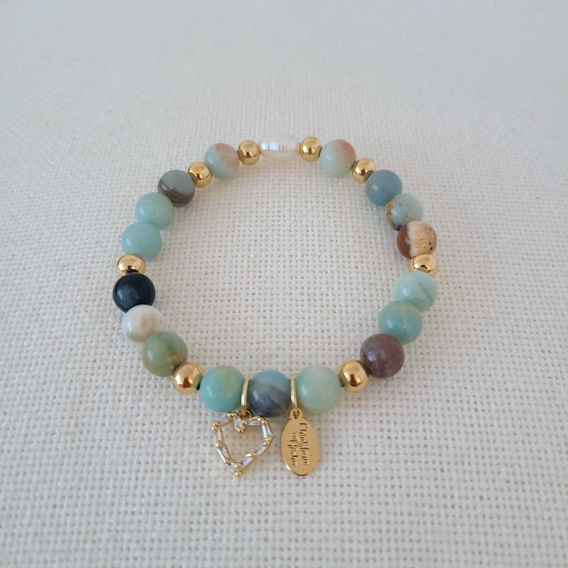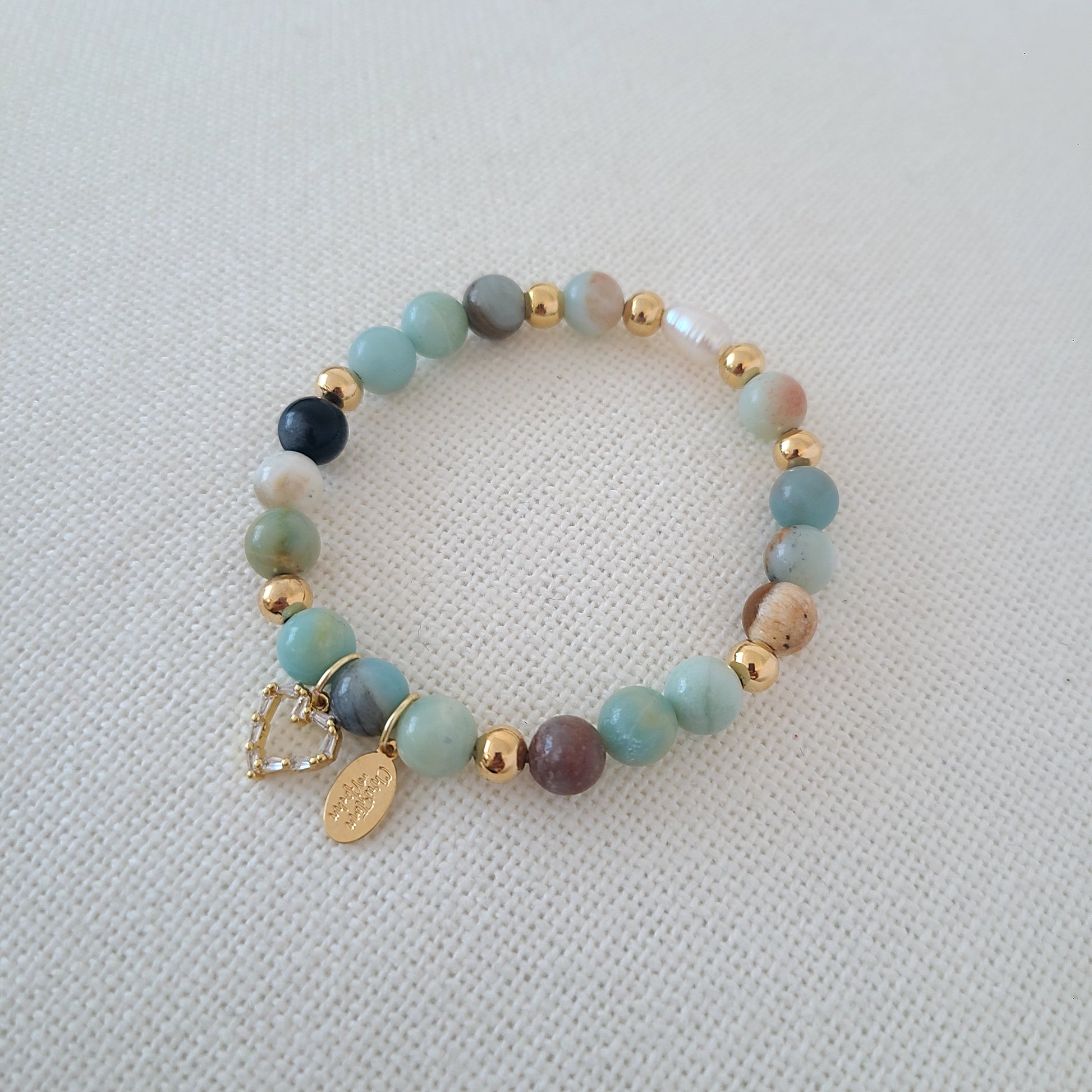 Ce magnifique et délicat bracelet est fait à la main avec des pierres précieuses d'Amazonite de 8 mm, une perle d'eau douce et des perles remplies d'or 14 carats. Le bracelet est orné d'une délicate breloque en forme de cœur.