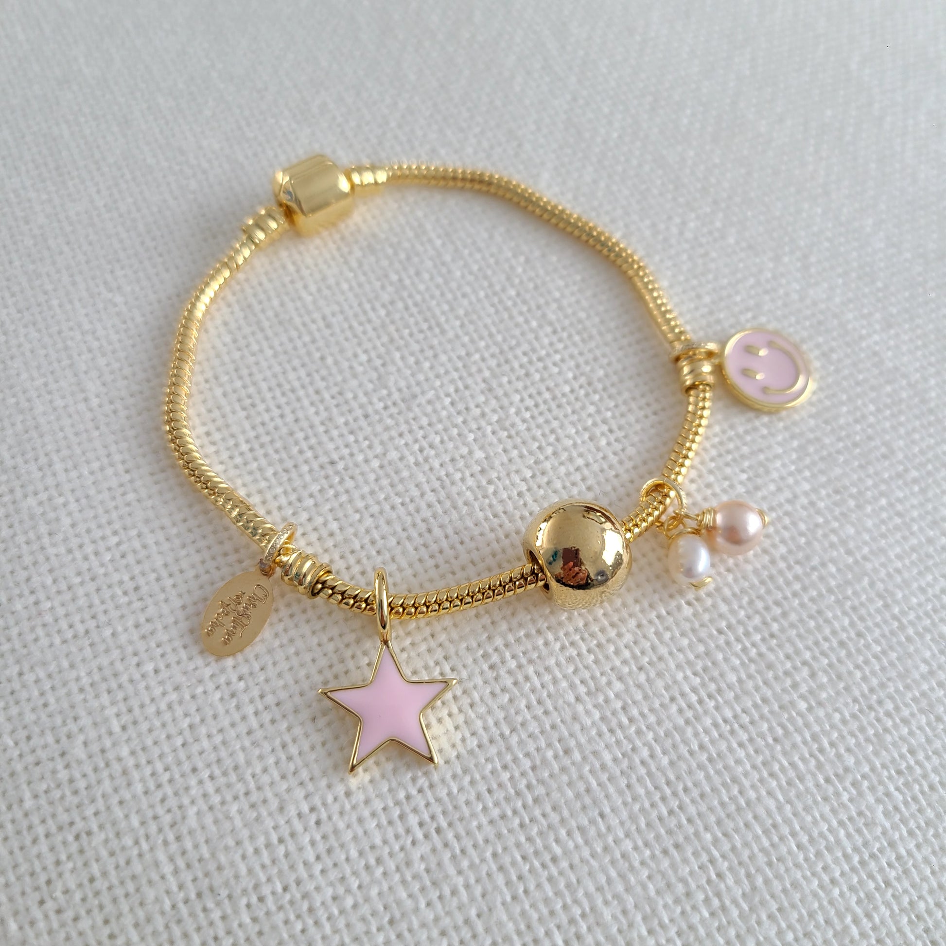 Une pièce délicate alliant élégance moderne et détails charmants. Ce bracelet est orné de charms étoiles et smileys roses, associés à des perles d'eau douce naturelles. Chaque élément est plaqué or 24 carats, lui conférant un éclat chaleureux et raffiné. Un accessoire unique pour exprimer votre style personnel avec grâce et individualité.