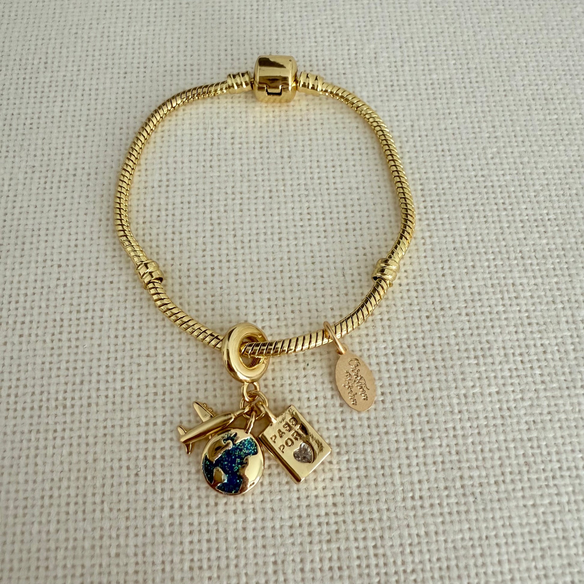 Ce charmant bracelet, inspiré du voyage, présente un design délicat plaqué or 24 carats orné de trois breloques symboliques : un globe terrestre, un passeport et un avion. Chaque breloque célèbre l’esprit d’aventure et la joie de découvrir le monde.