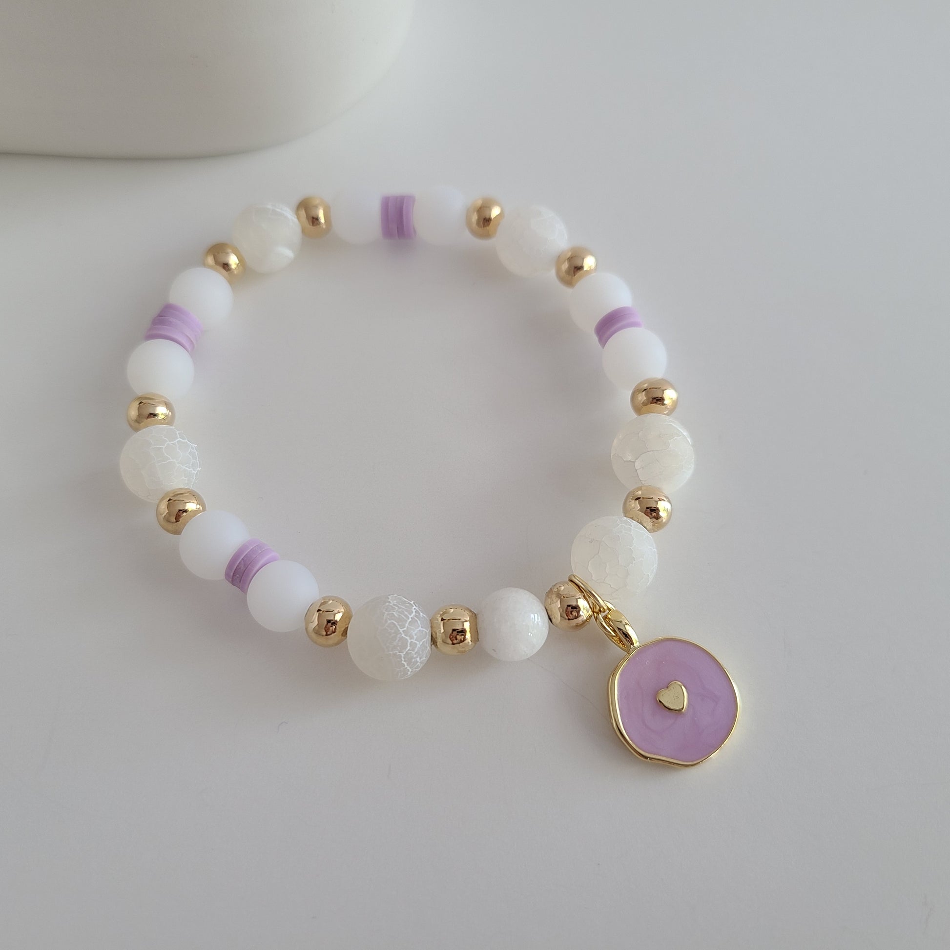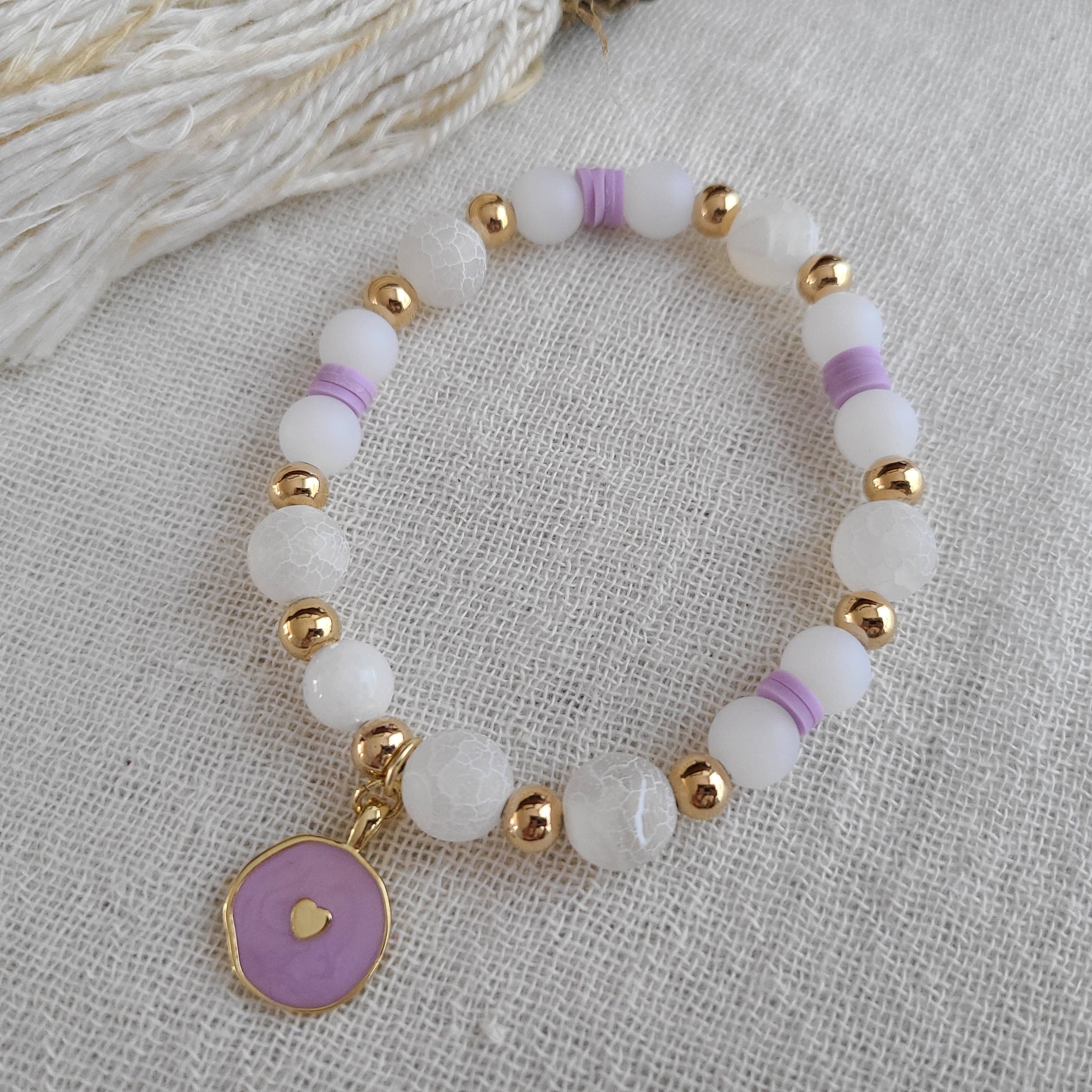 Ce magnifique et délicat bracelet est fabriqué à la main avec des pierres précieuses en jade blanc de 8 mm et des perles remplies d'or 14 carats. Le bracelet est orné d'une jolie breloque en forme de cœur lilas.
