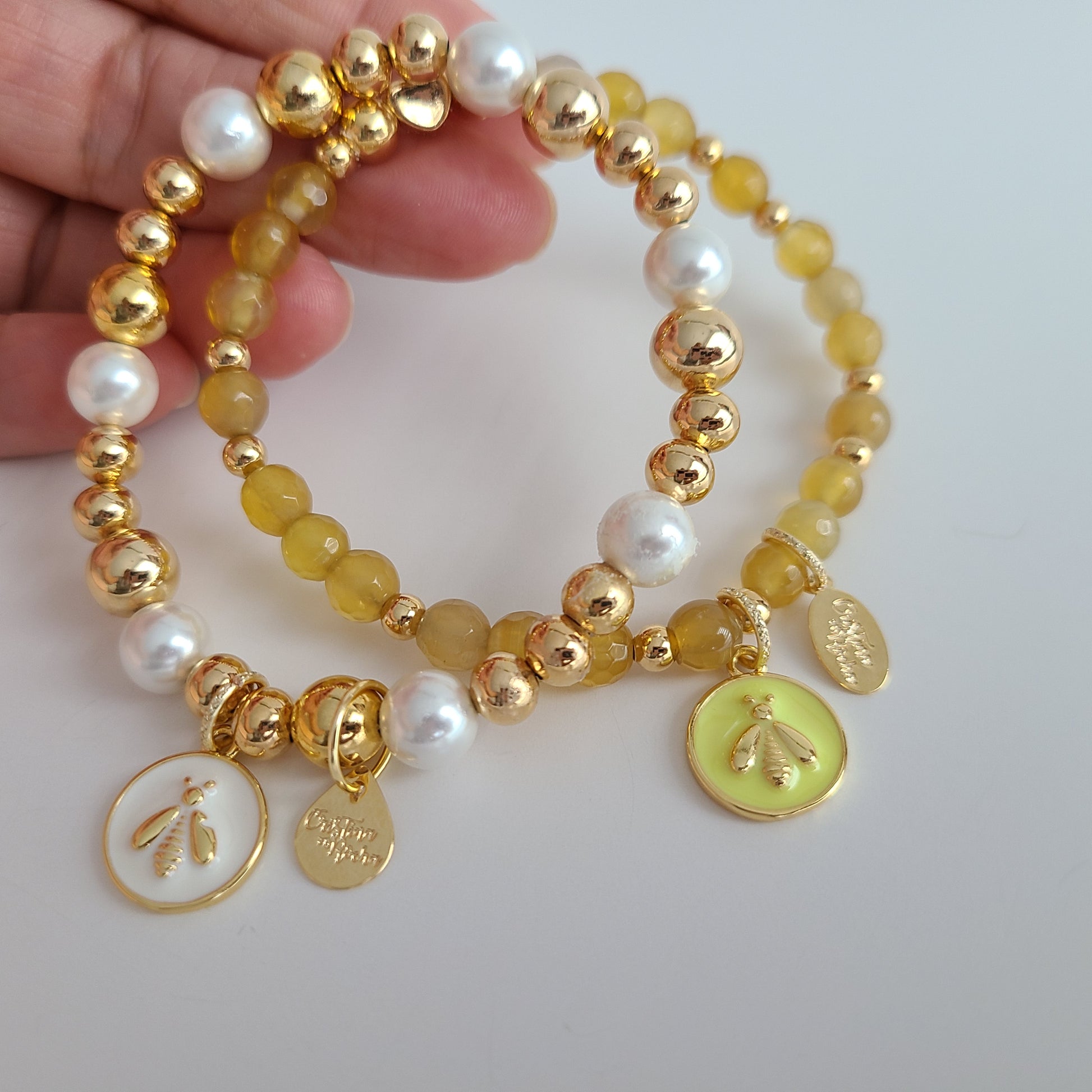 Ce magnifique et délicat bracelet est fabriqué à la main avec des pierres précieuses à facettes en agate jaune de 6 mm et des perles remplies d'or 14 carats. Le bracelet comporte un petit cœur décoratif en or rempli 14 carats et une belle breloque libellule jaune et or.