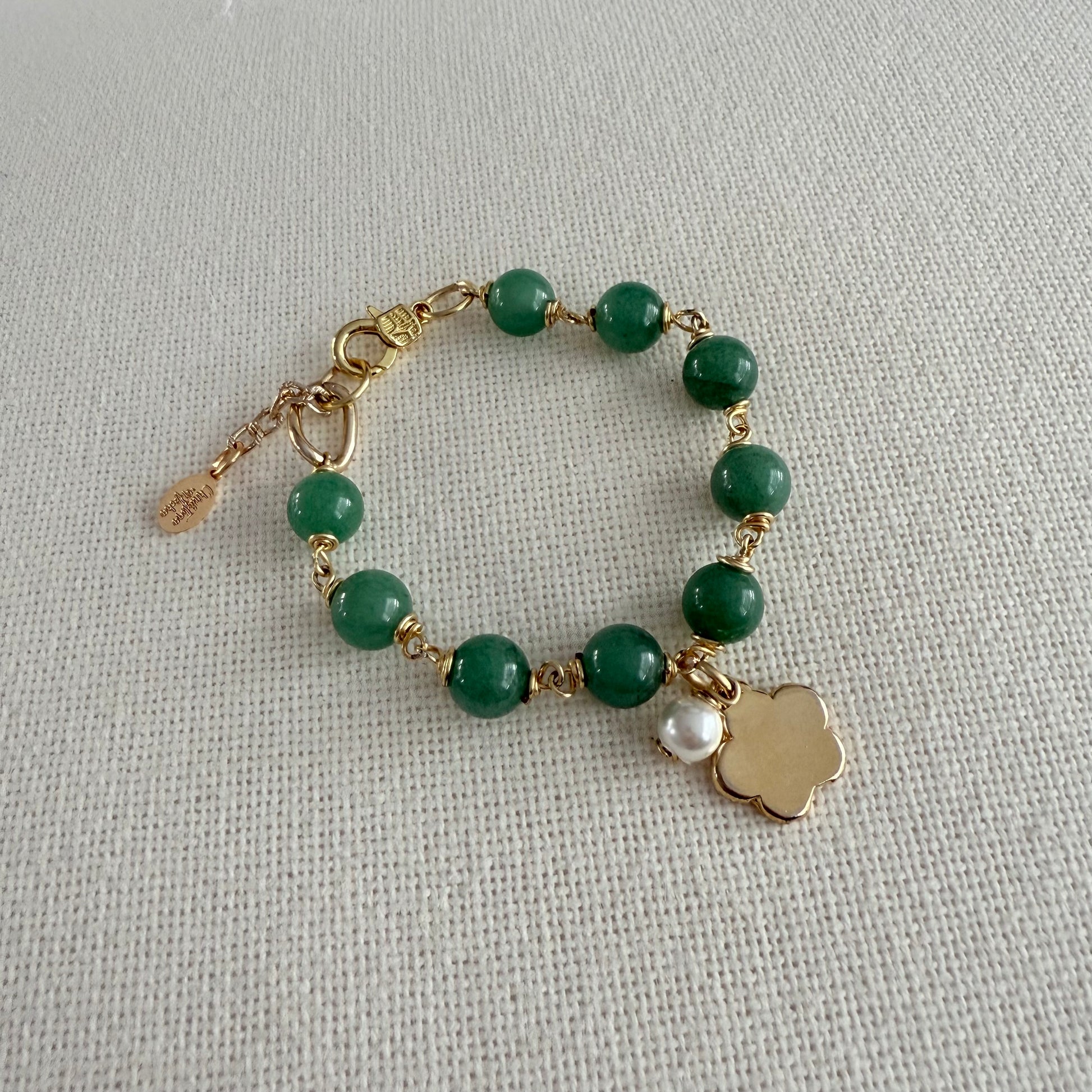 A delicate, handcrafted bracelet featuring faceted green agate stones (10 mm), each one wire-wrapped with 14K gold-filled thread. A charming flower charm and a single pearl add a soft, elegant touch.