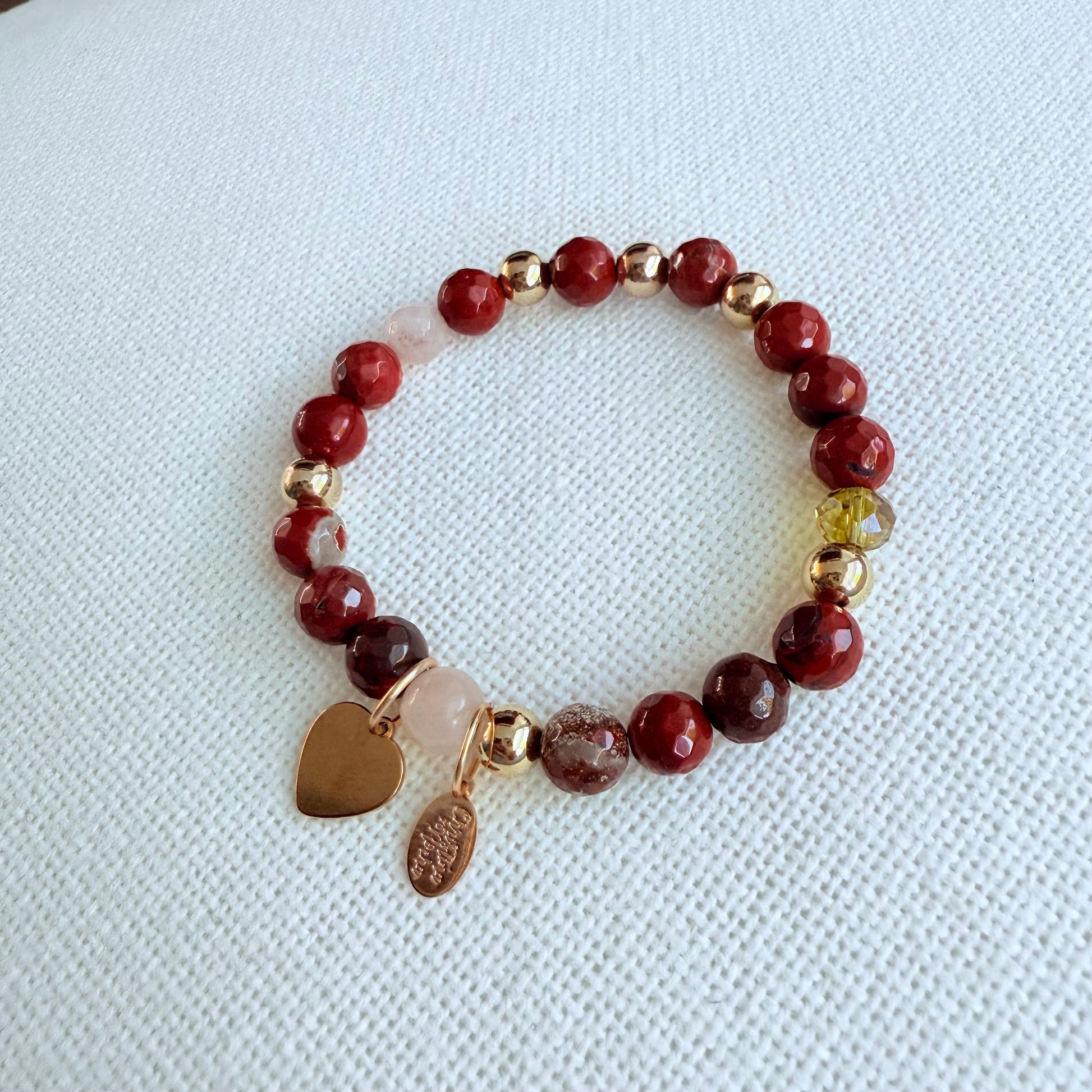 A delicate and refined bracelet, featuring semi-precious agate stones in autumn red hues, perfect for highlighting the beauty of the season. Each stone radiates a natural warmth that pairs beautifully with the 14K gold filled details, adding a touch of sophistication. The design is completed with a dainty heart charm, a symbol of love and timeless elegance. A feminine and versatile piece, crafted to accompany your days with subtlety and style.