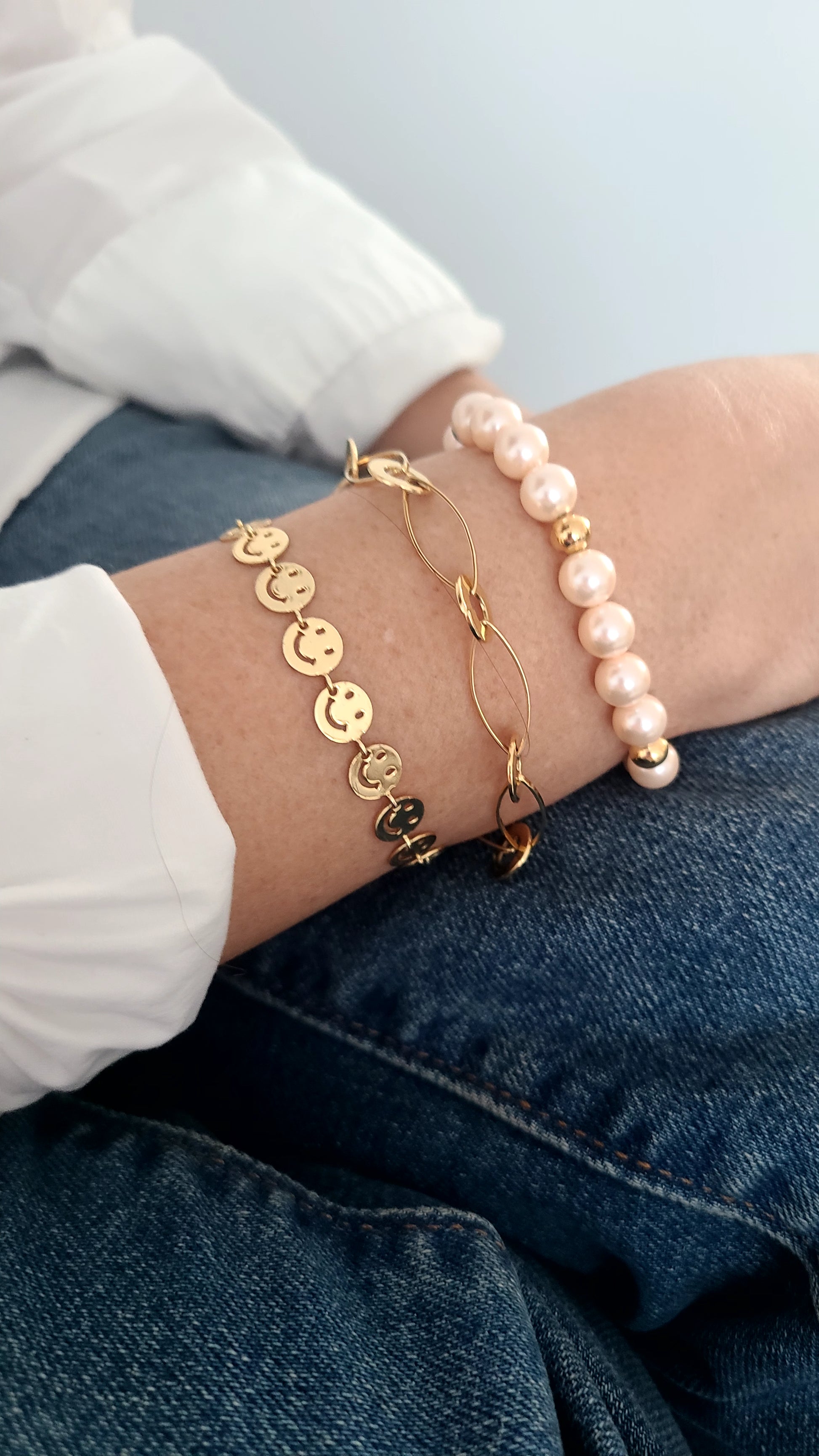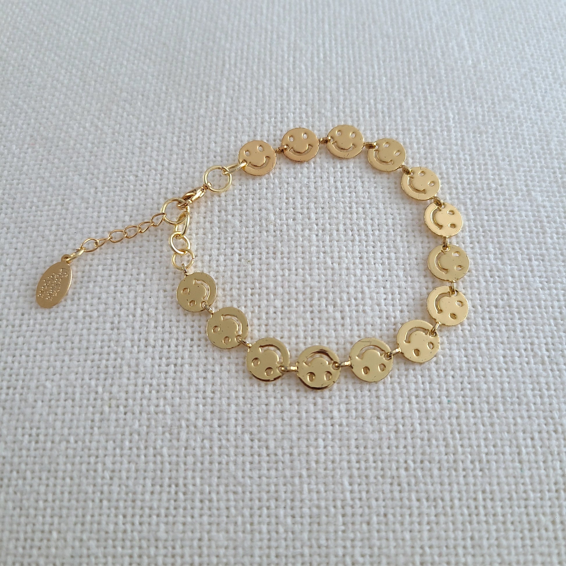 This 14K gold filled bracelet, adorned with charming smiley faces, radiates pure joy. With an adjustable extender for a perfect fit,