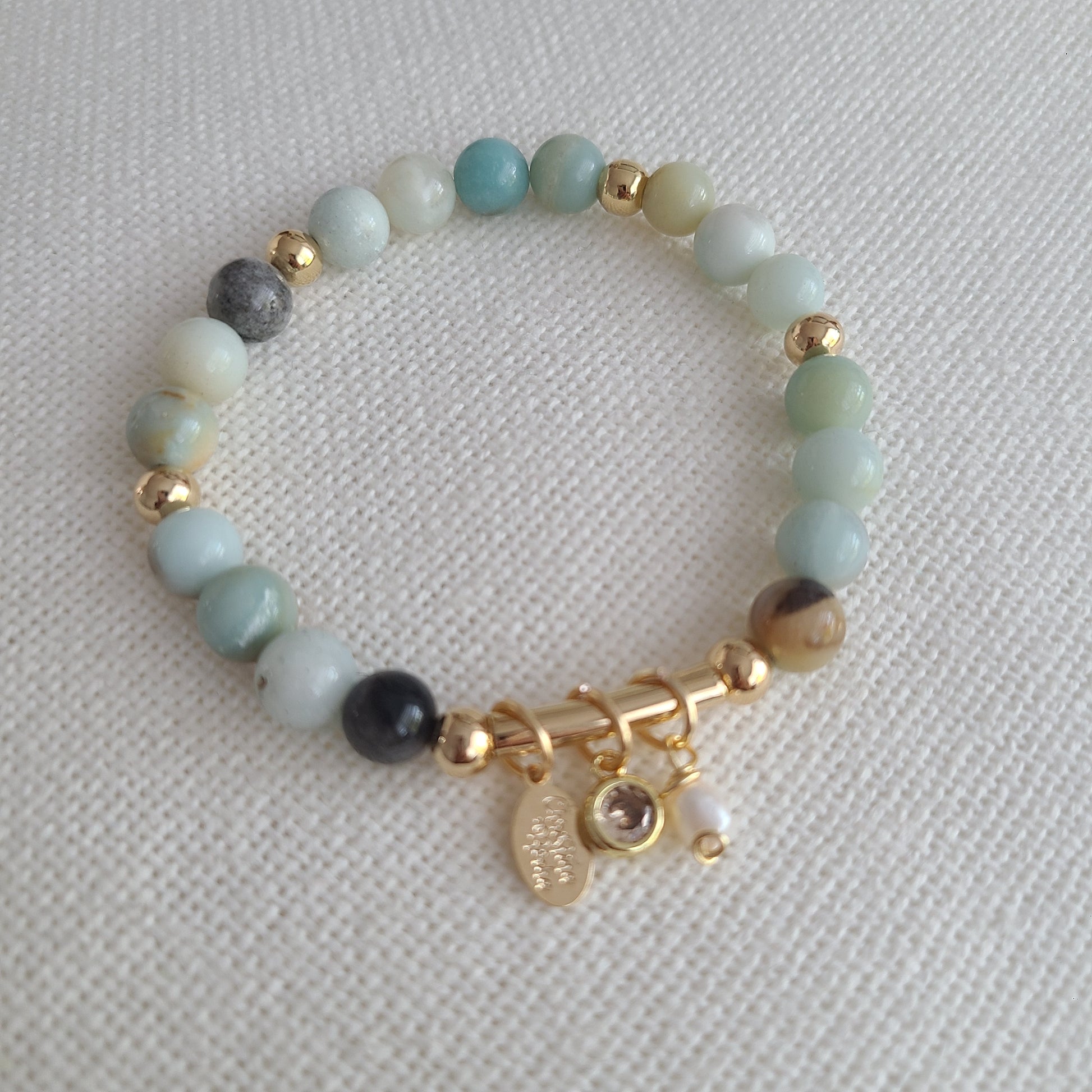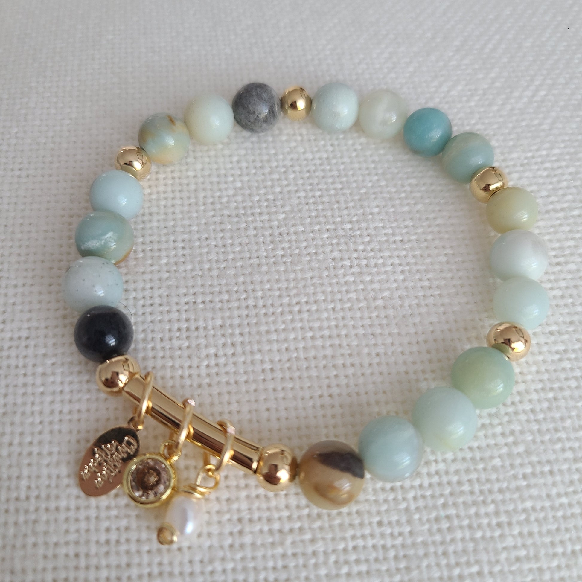 This beautiful and delicate bracelet is handcrafted with 8mm Amazonite gemstones and 14k gold filled beads. The bracelet has a decorative detail in 14K gold filled with a beautiful crystal charm and a freshwater pearl.