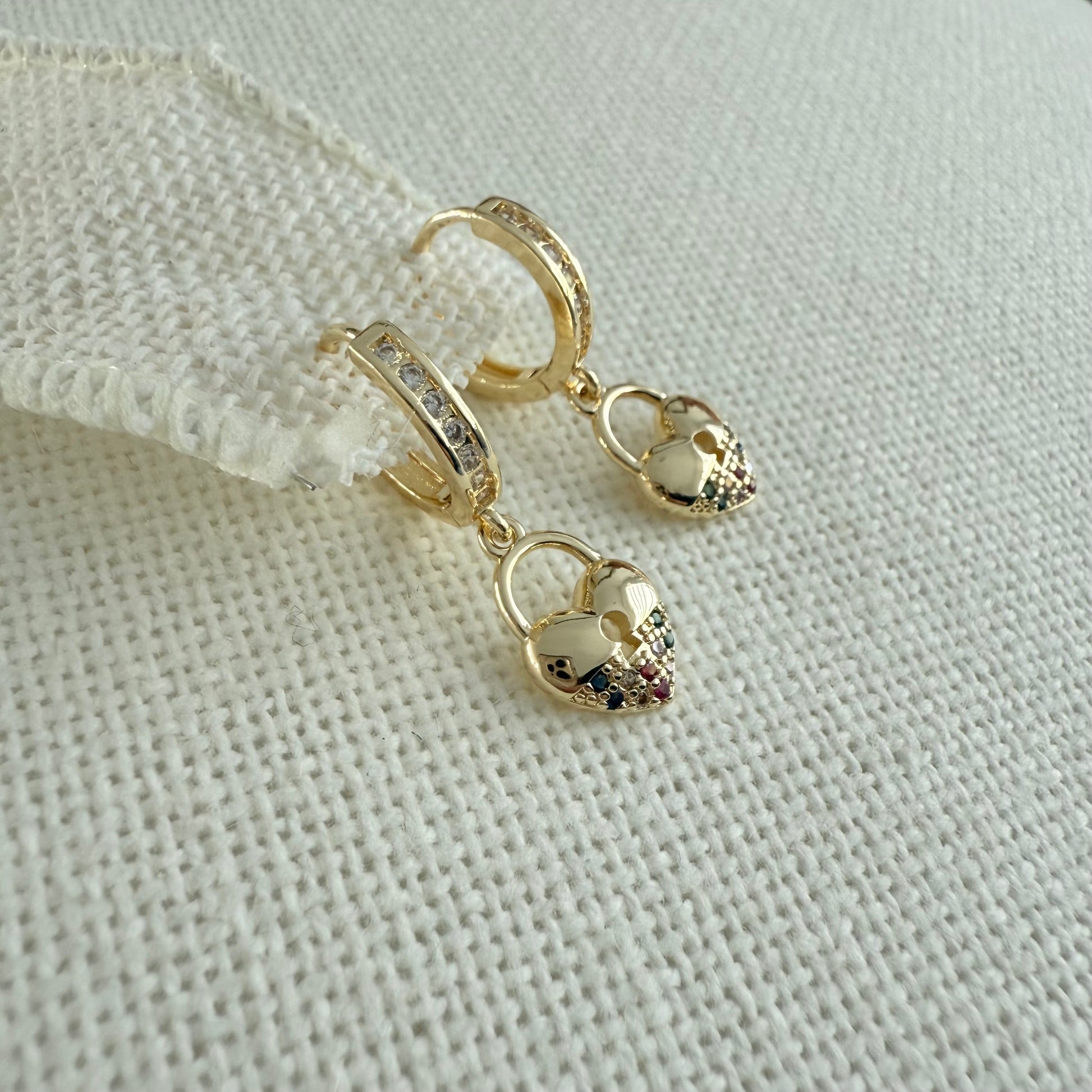 These charming 14K gold-filled earrings feature crystal-lined hoops with dainty heart pendants adorned with tiny multicolor crystals.