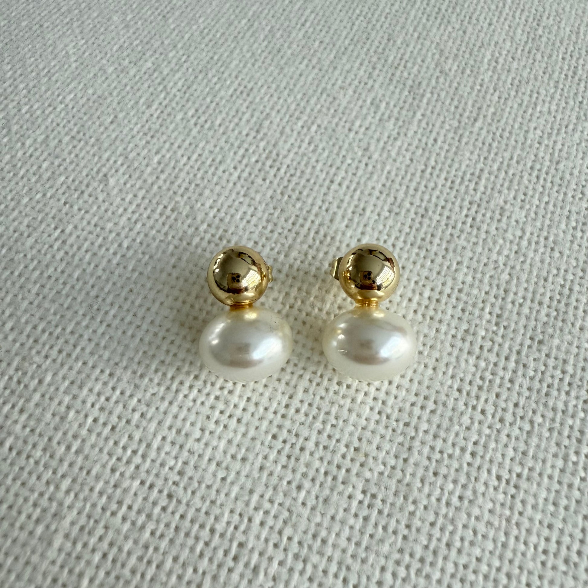 These delicate 14K gold-filled earrings feature a luminous pearl set on a sleek, golden base.