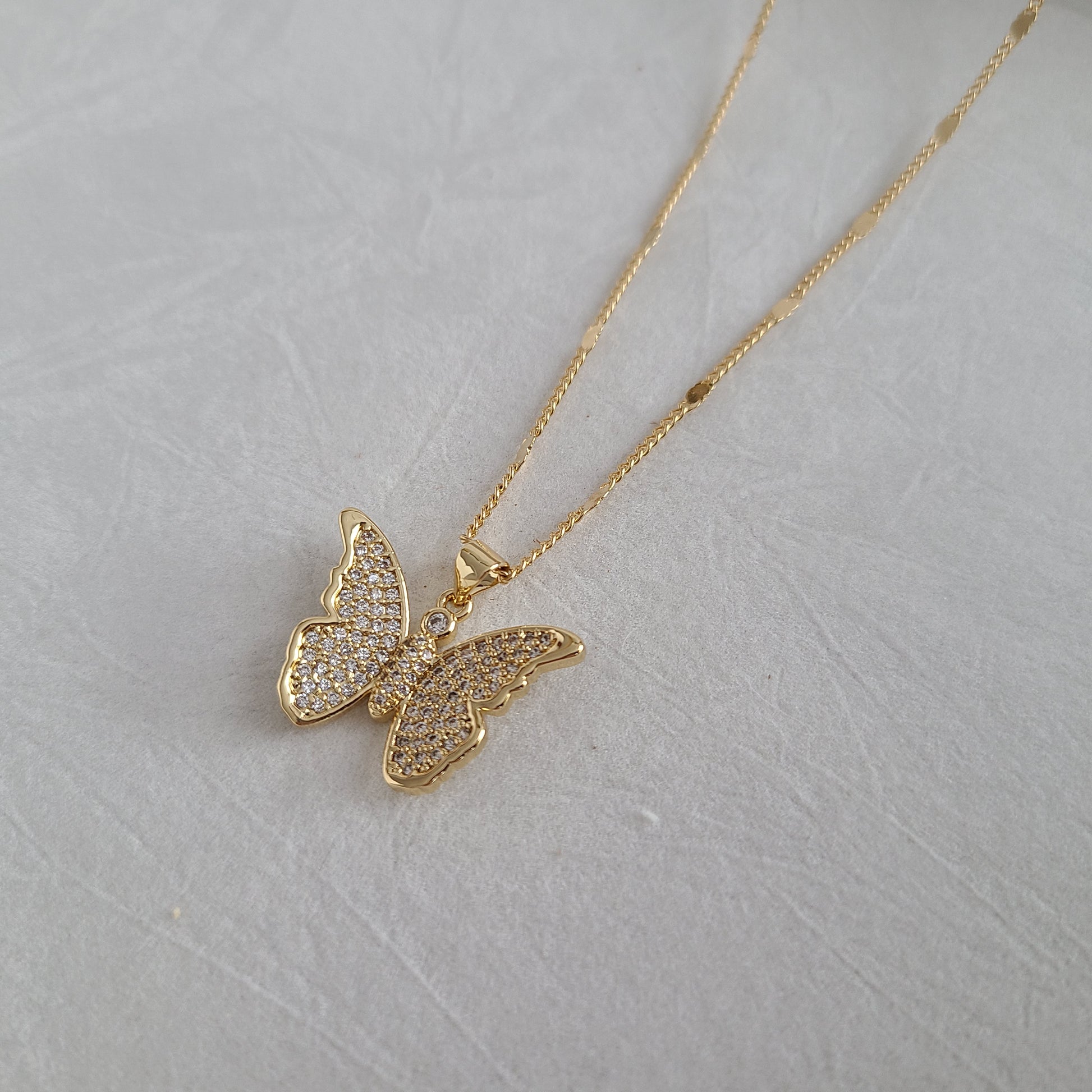 This lovely necklace features a 14K gold-filled chain paired with a luxurious butterfly pendant adorned with sparkling zircon crystals.