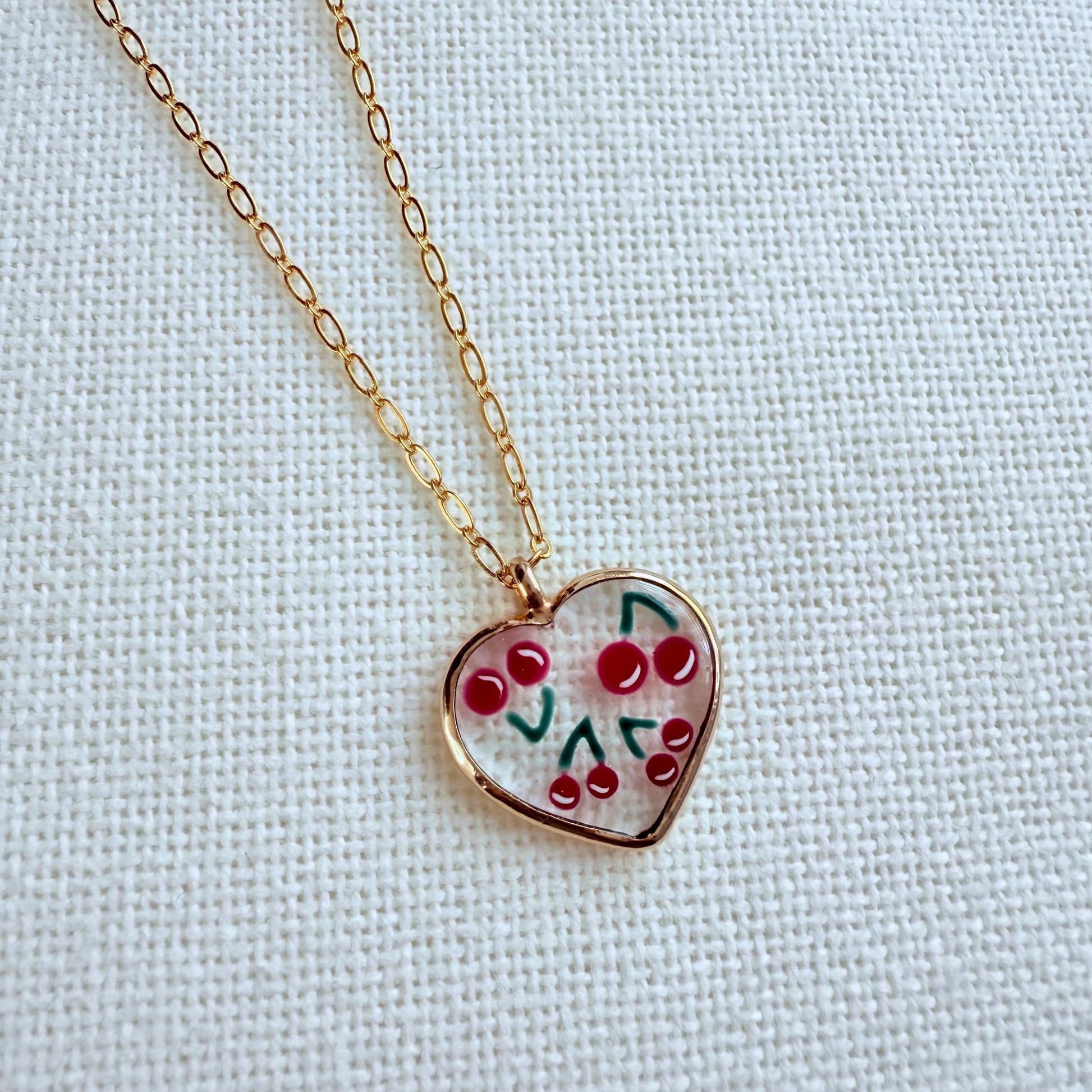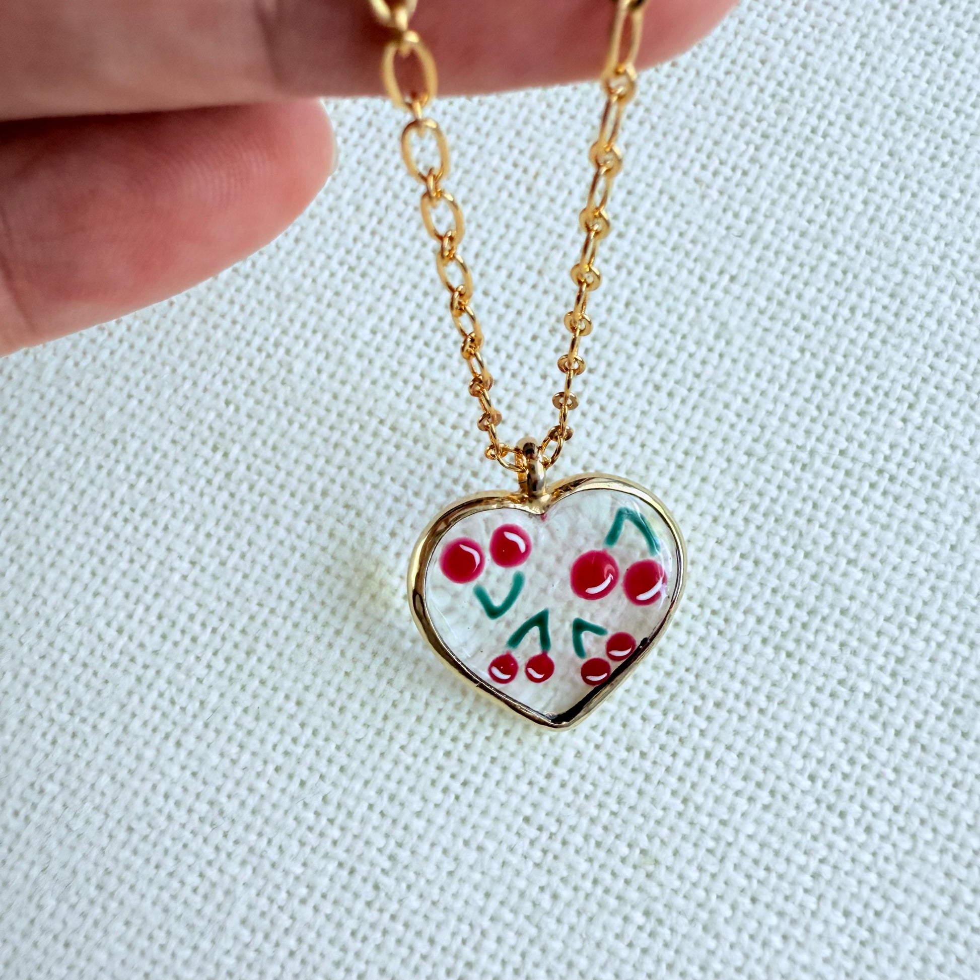 A playful and delicate necklace featuring a Murano glass heart pendant with charming cherry motifs. The transparent glass design adds a light and versatile touch, making it a unique piece to complement any look. Crafted with a durable 14K gold-filled chain for lasting shine and comfort.