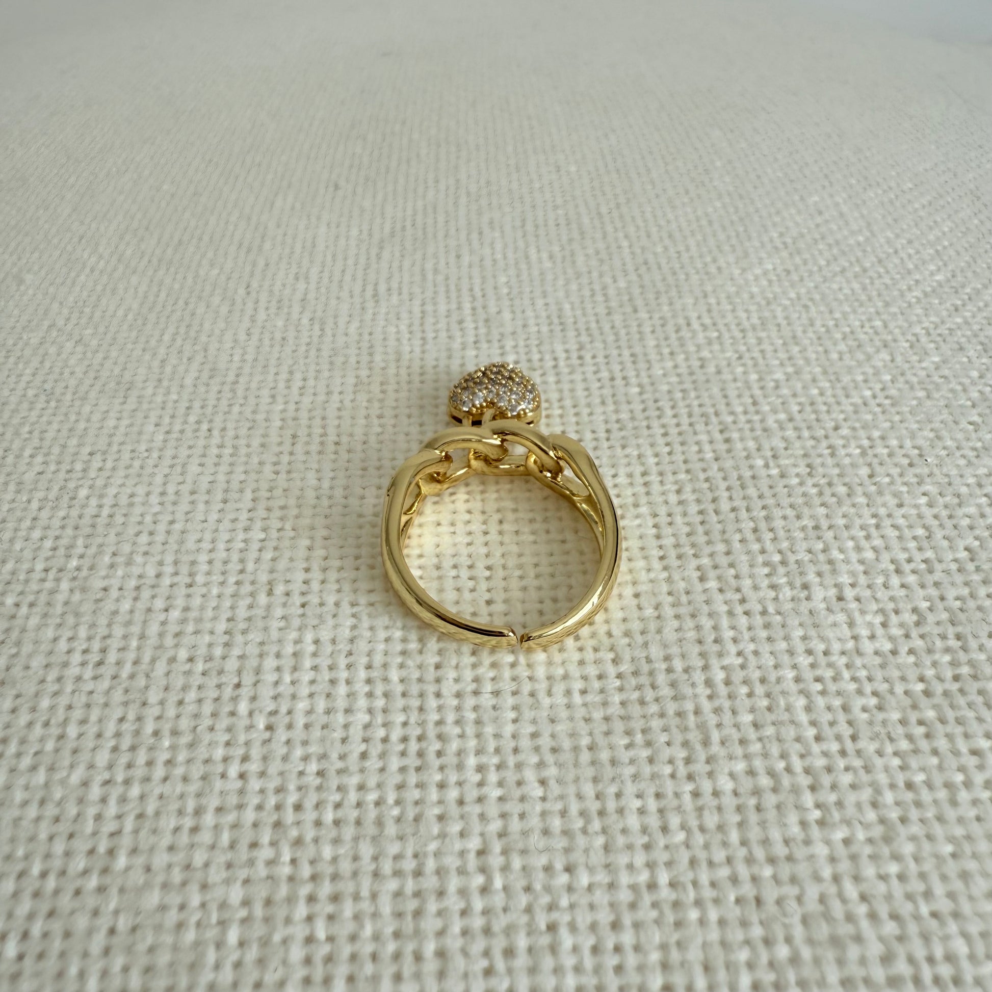 A beautifully crafted 24K gold-plated ring featuring a delicate braided center and a charming heart pendant adorned with shimmering micro-crystals.