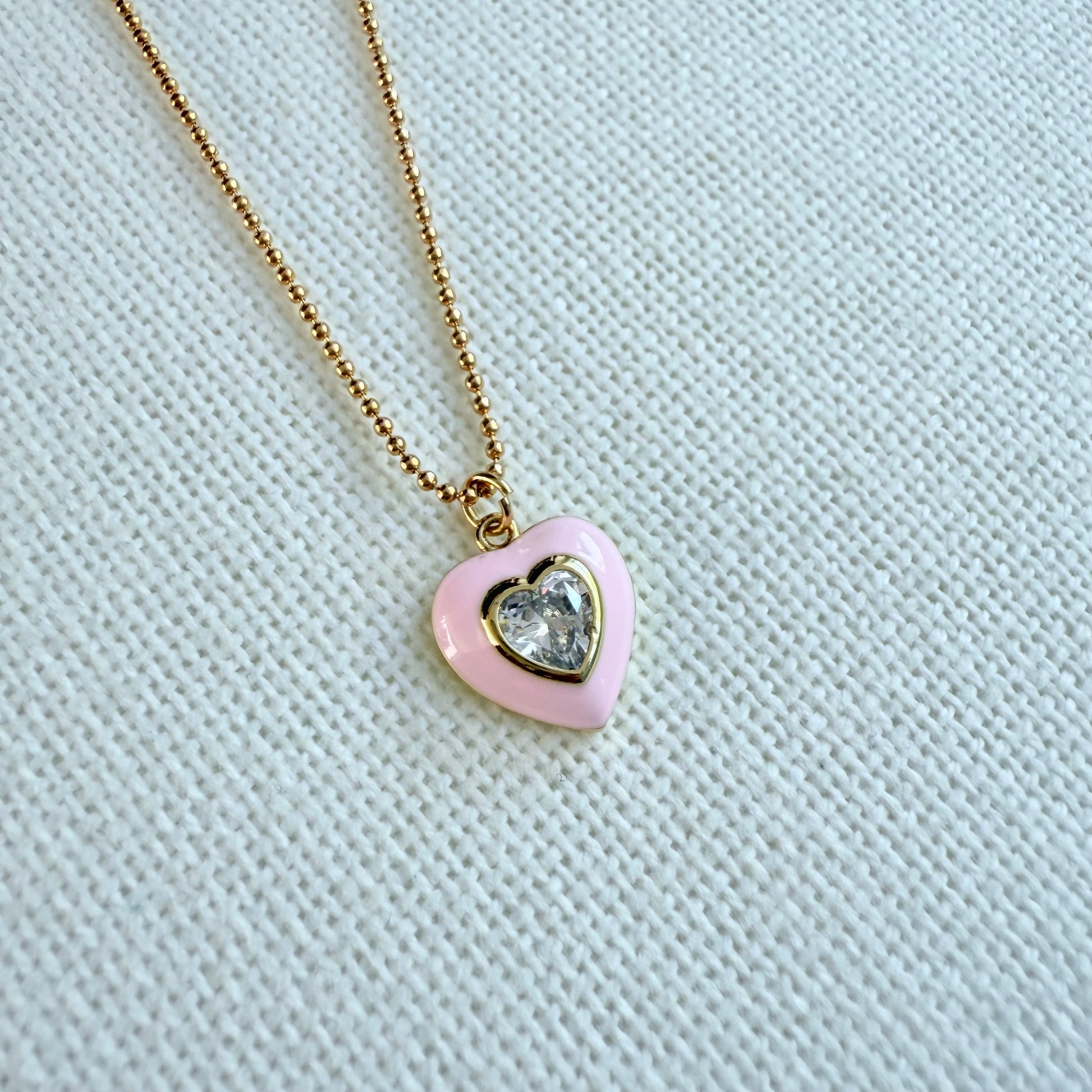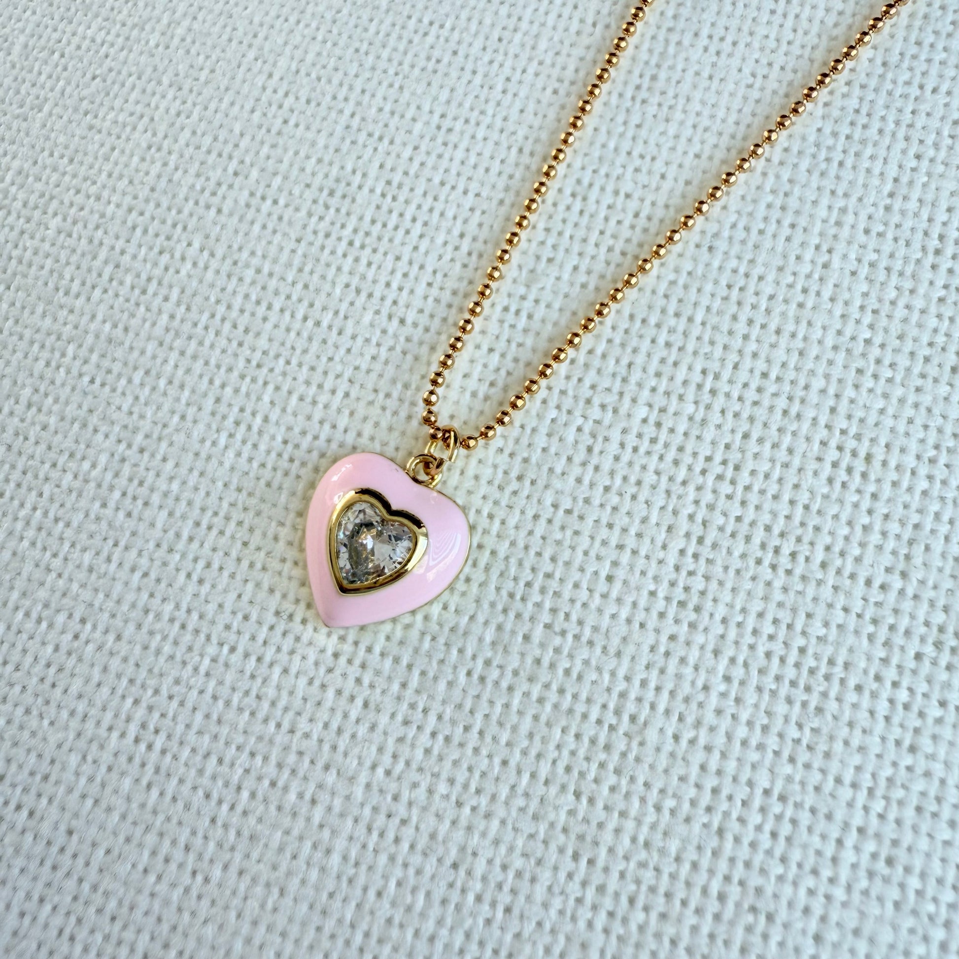 This beautiful design features a light pink heart with a sparkling crystal heart in the center, adding a touch of elegance and charm to your everyday style. The chain is made of 14K gold filled, offering durability and a lovely shine. Perfect for those who adore feminine and meaningful accessories.