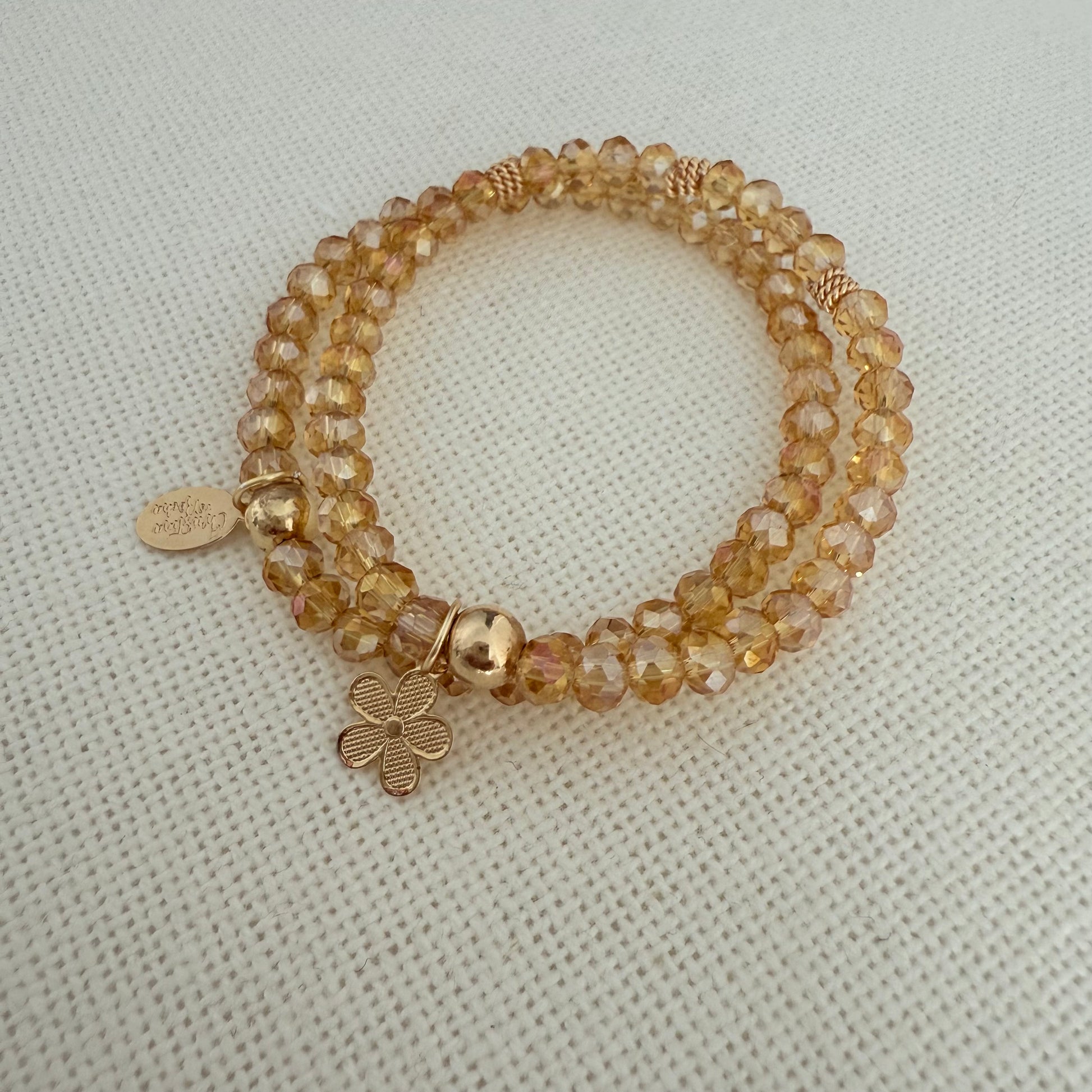 This handmade double bracelet features golden Murano crystals with 14K gold filled accents, finished with a delicate flower charm. An elegant and feminine piece designed to add a subtle glow to your everyday style.