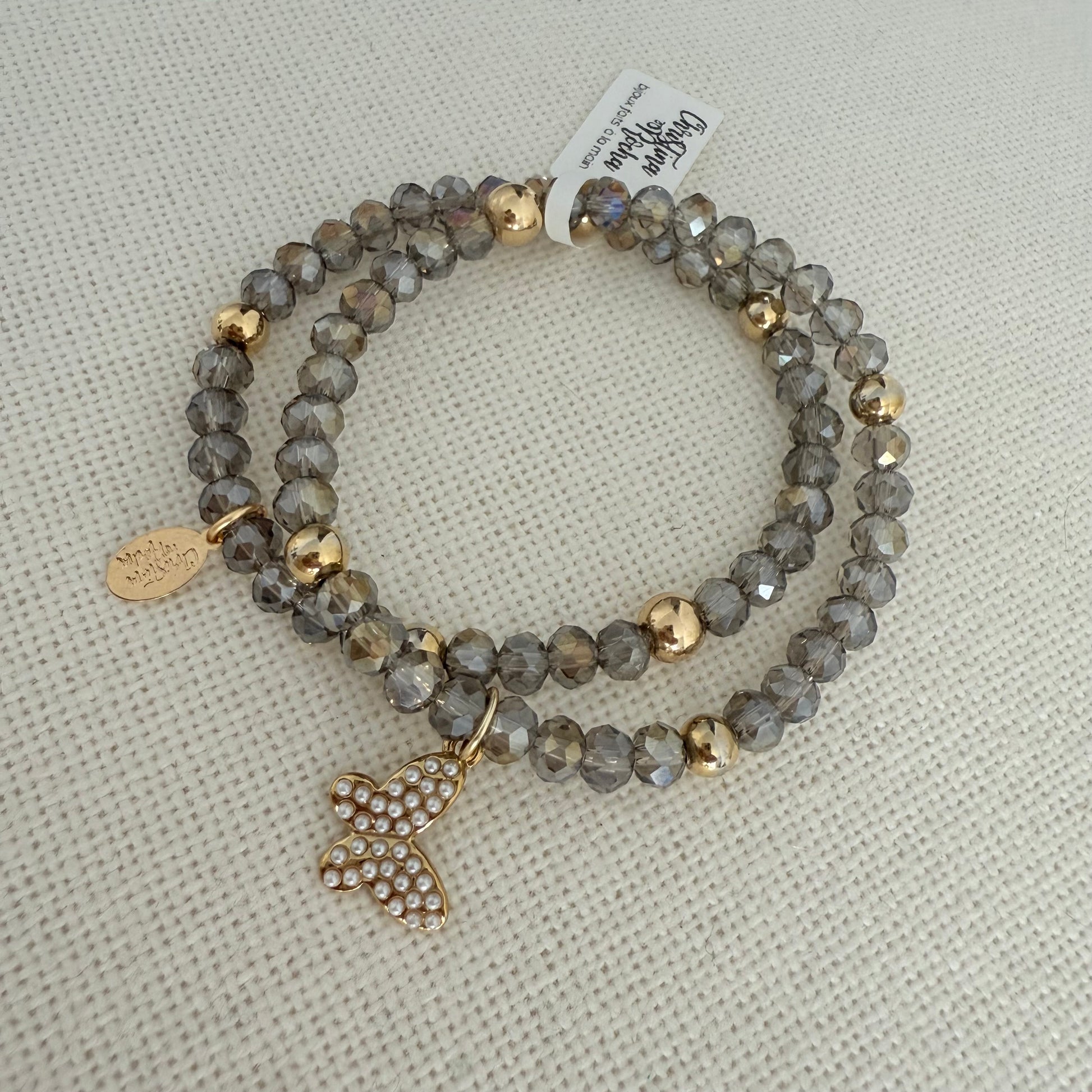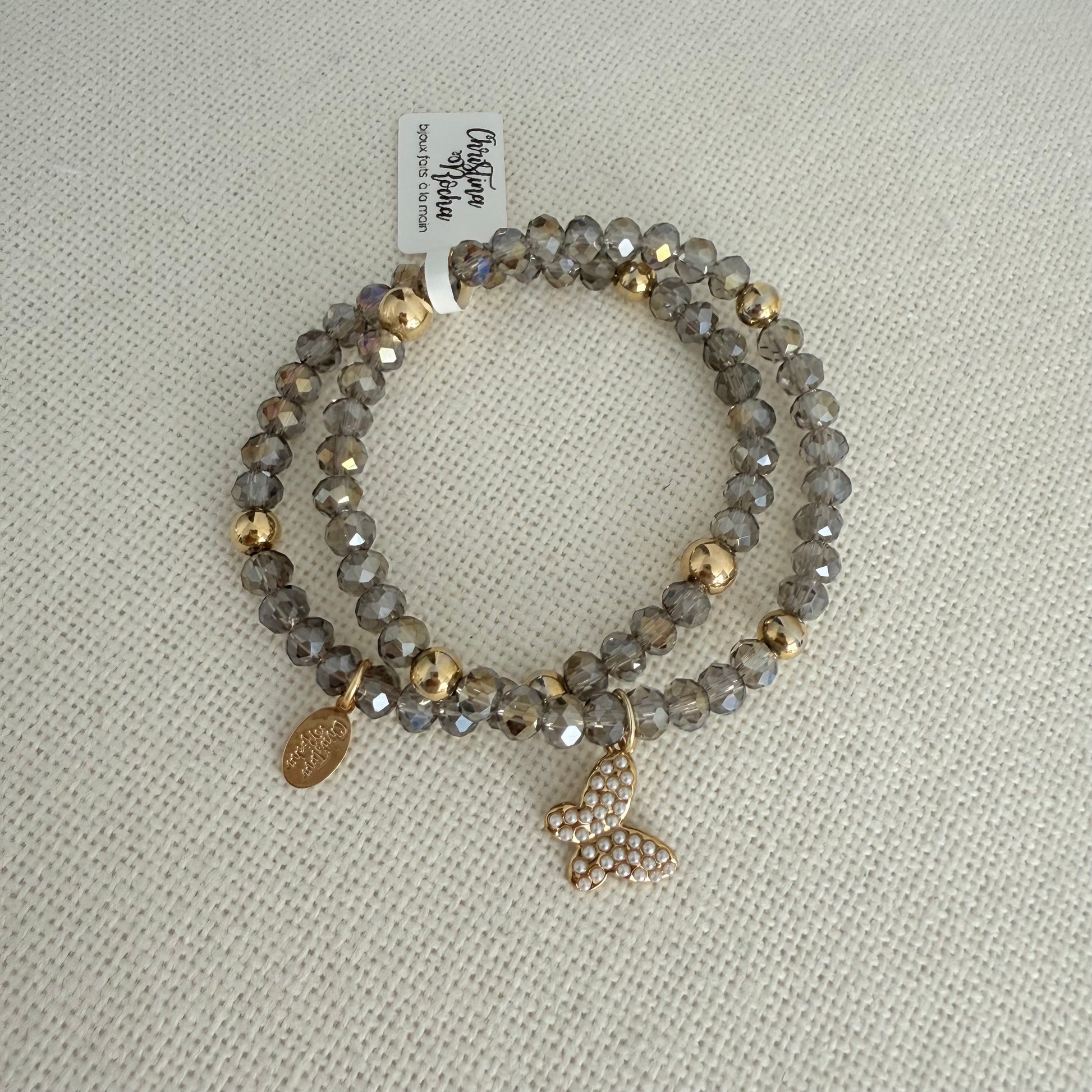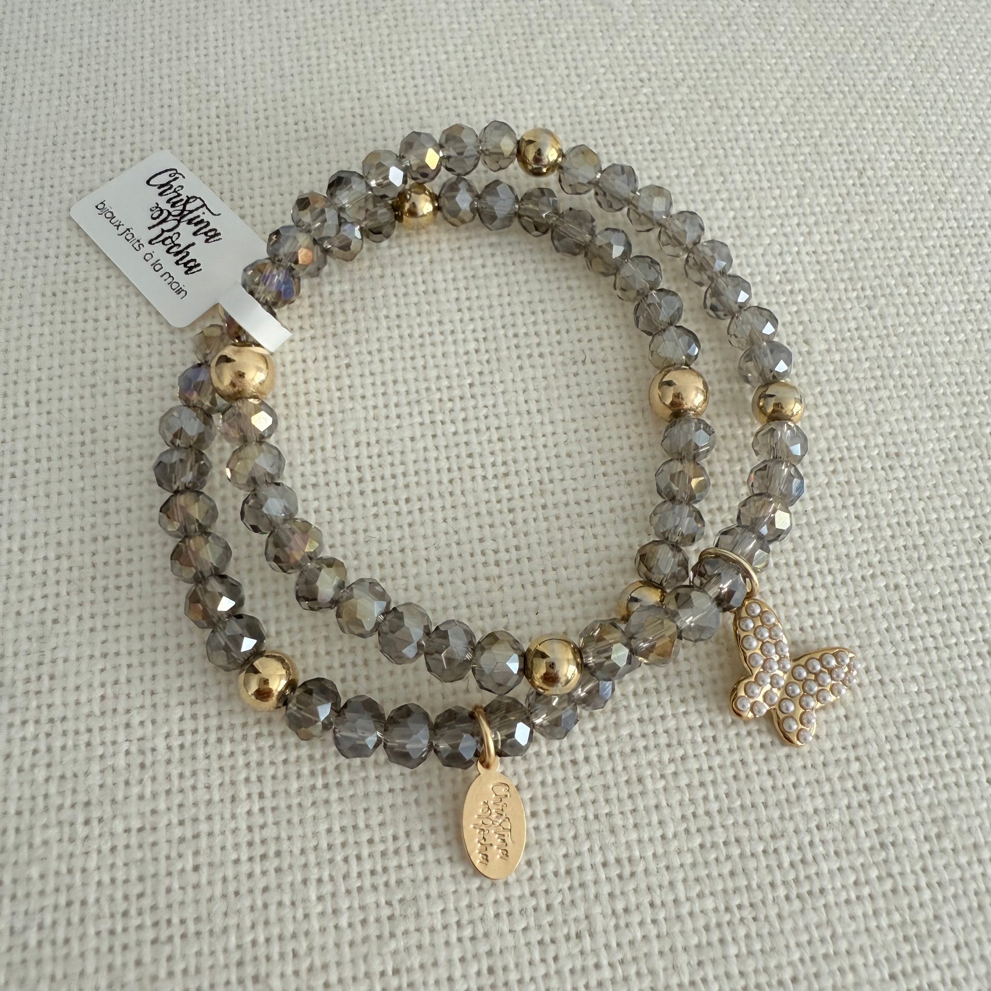 This handmade double bracelet combines silver-toned Murano crystals with 14K gold filled accents, finished with a delicate gold butterfly charm adorned with tiny crystals. A refined and feminine piece, perfect for everyday elegance.