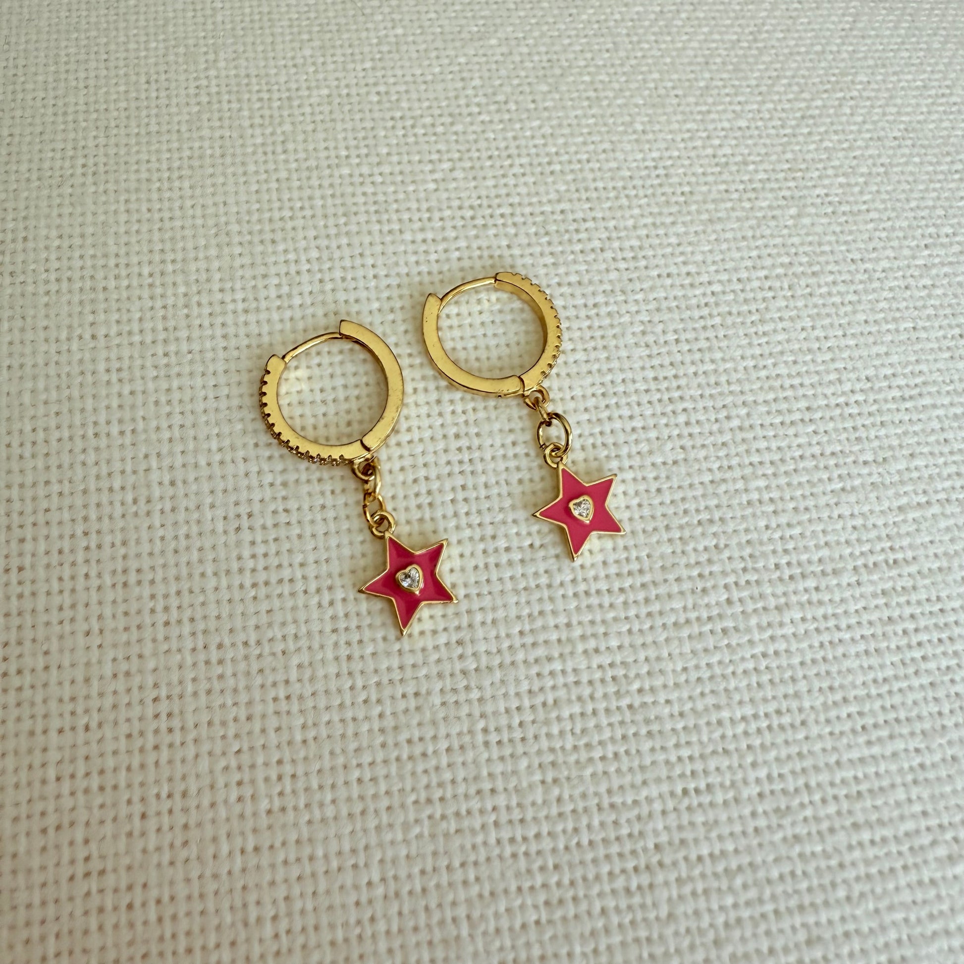 Delicate and dreamy, these 24K gold plated hoops are adorned with sparkling crystal details and feature soft pink star charms that gently dangle with every movement. Lightweight, hypoallergenic, and full of charm — perfect for adding a subtle celestial glow to your everyday look.