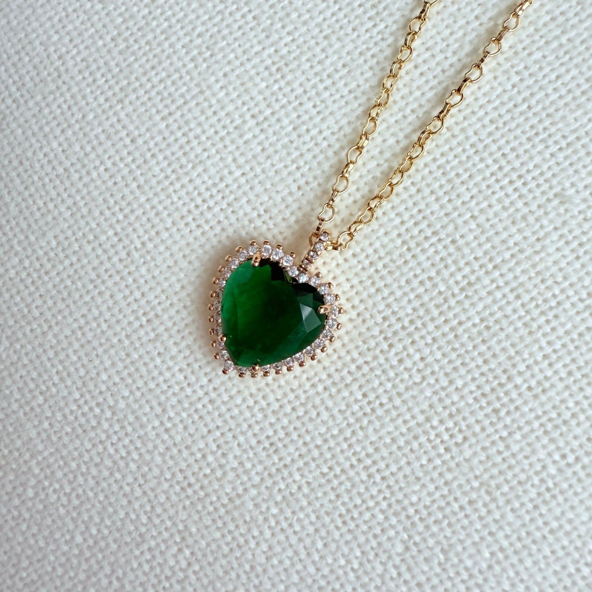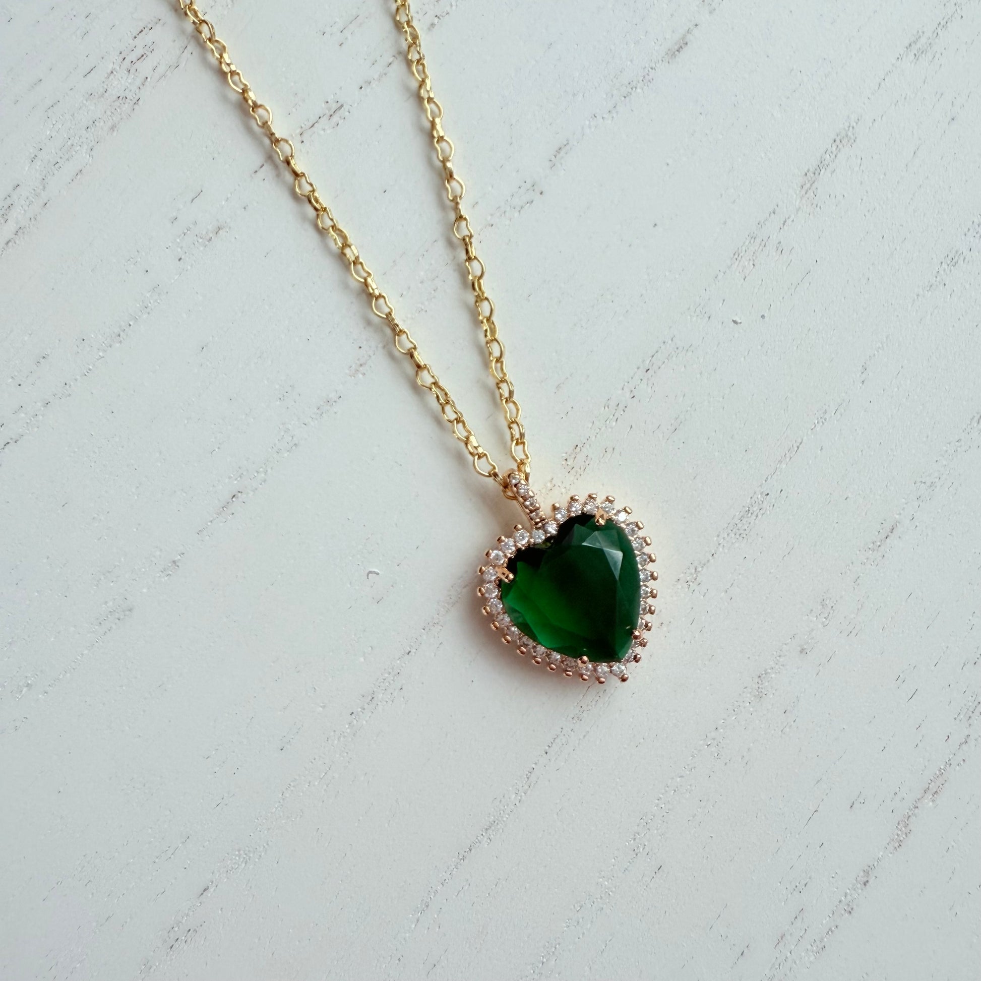 Elegant and refined, this 14K gold filled necklace features a heart-shaped pendant adorned with a vibrant emerald green crystal. Surrounded by delicate, shimmering accents, it adds a subtle touch of sparkle and sophistication to any look.