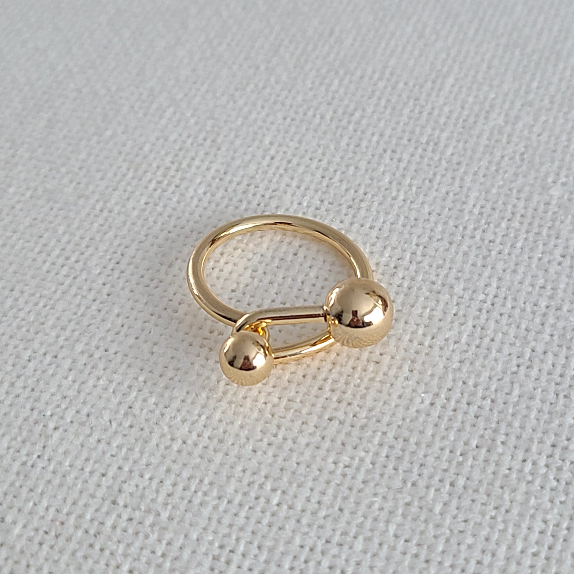 This elegant ring features a refined crossover design, accented with two polished gold beads at each tip. Made in gold-finish rhodium, it's adjustable, hypoallergenic, and designed for effortless everyday elegance.