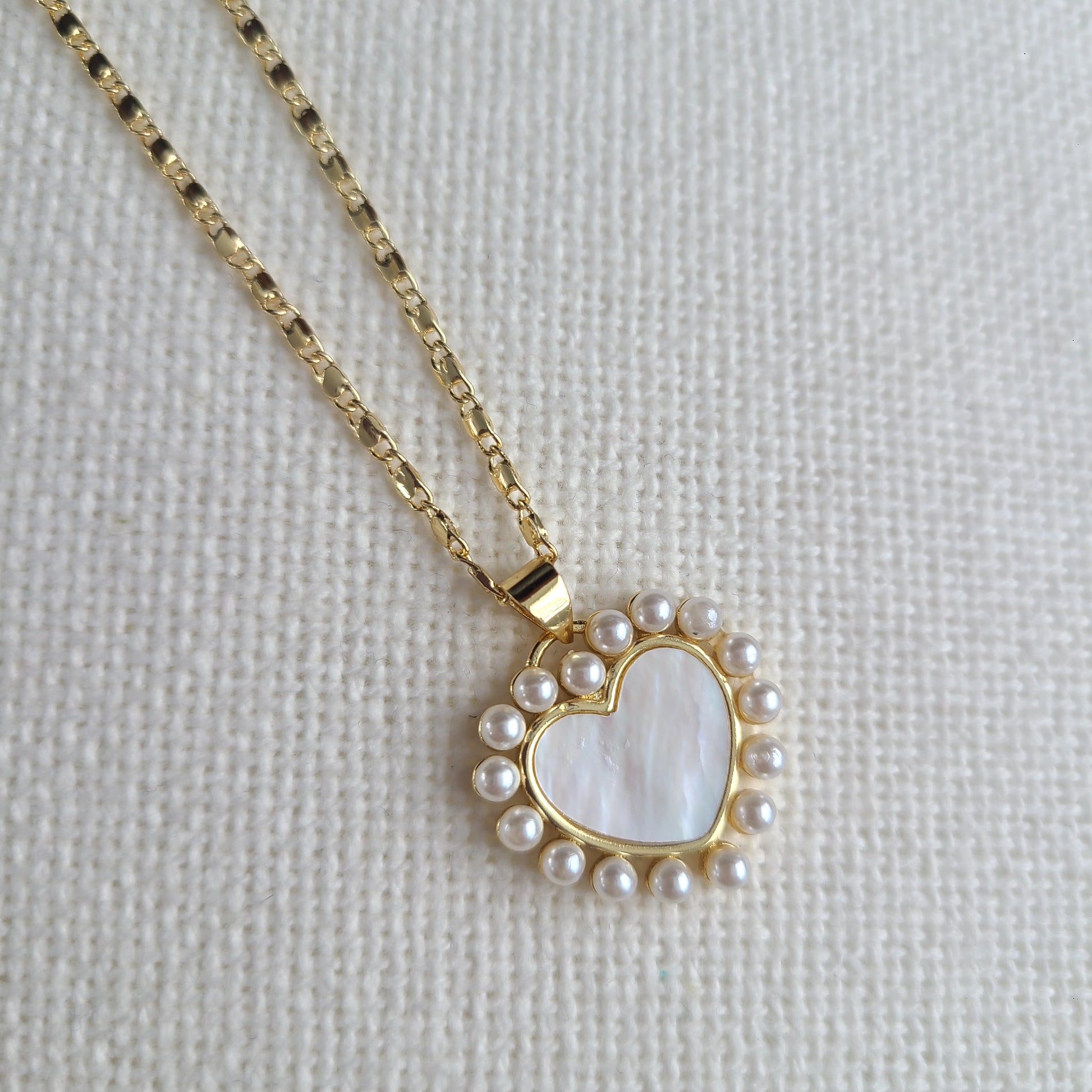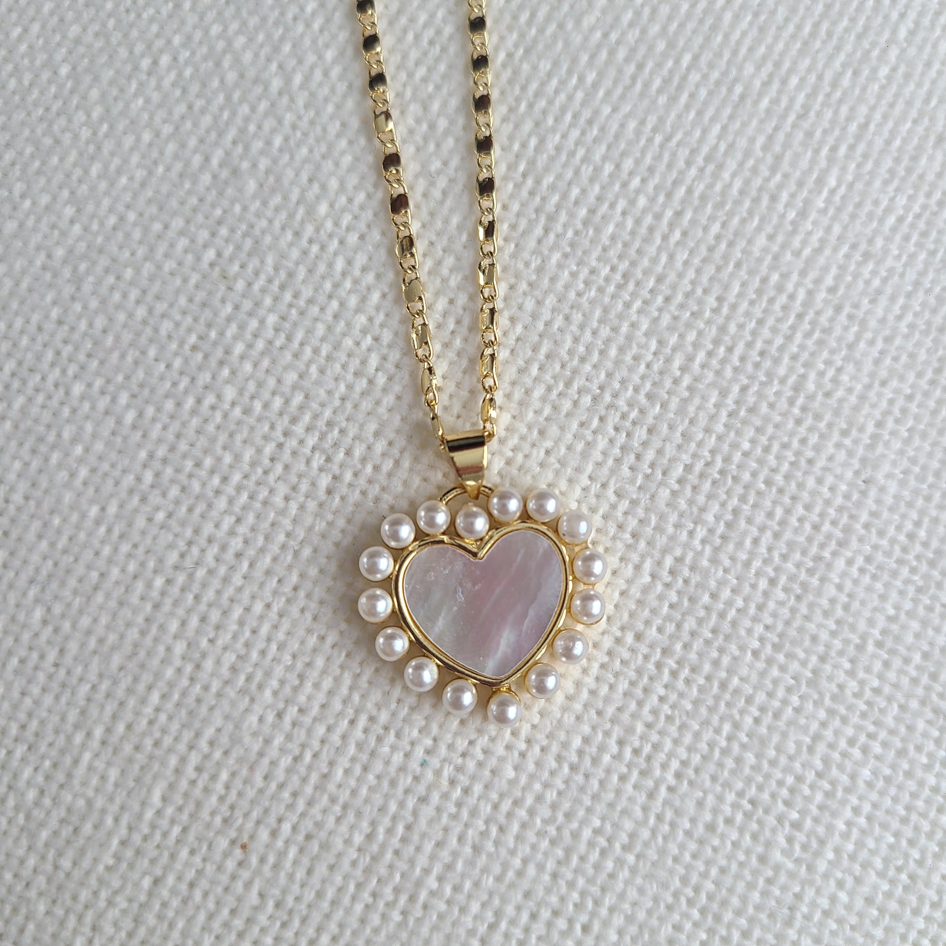 This stunning necklace features a delicate 14K gold filled chain, paired with a beautiful mother of pearl heart charm and accented with dainty small pearls. Its elegant design is both timeless and sophisticated, making it a perfect addition to any jewelry collection.