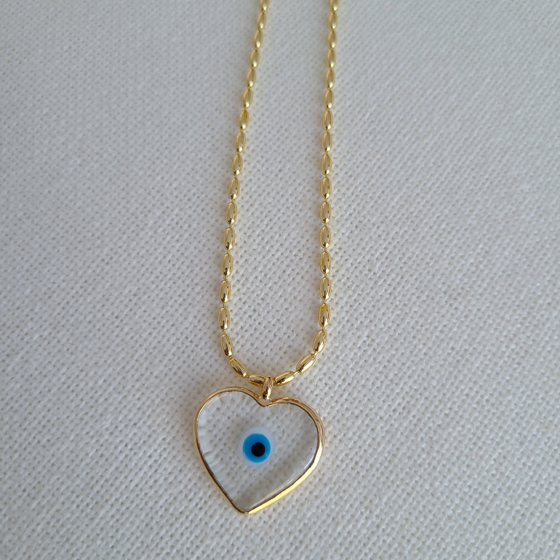 A necklace that blends elegance, meaning, and craftsmanship. This refined piece features a Murano glass heart and a Turkish eye pendant, hand-set in gold on a 14K gold-filled chain.