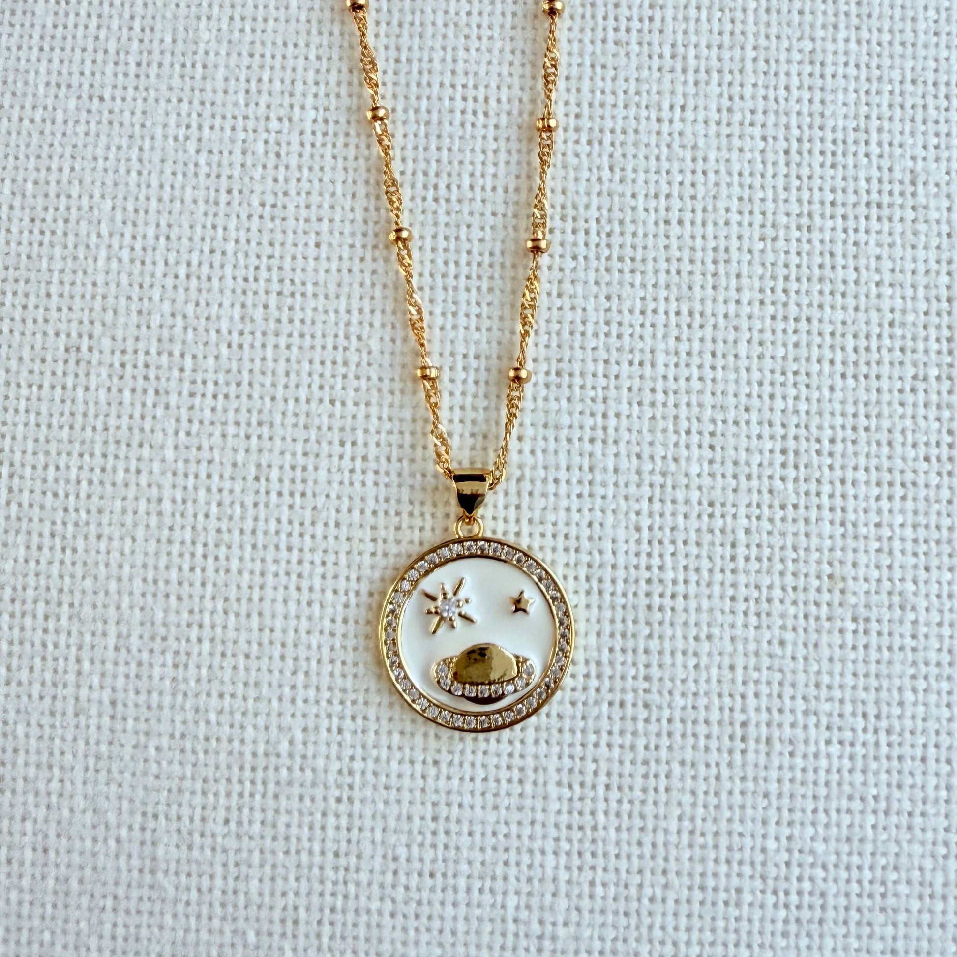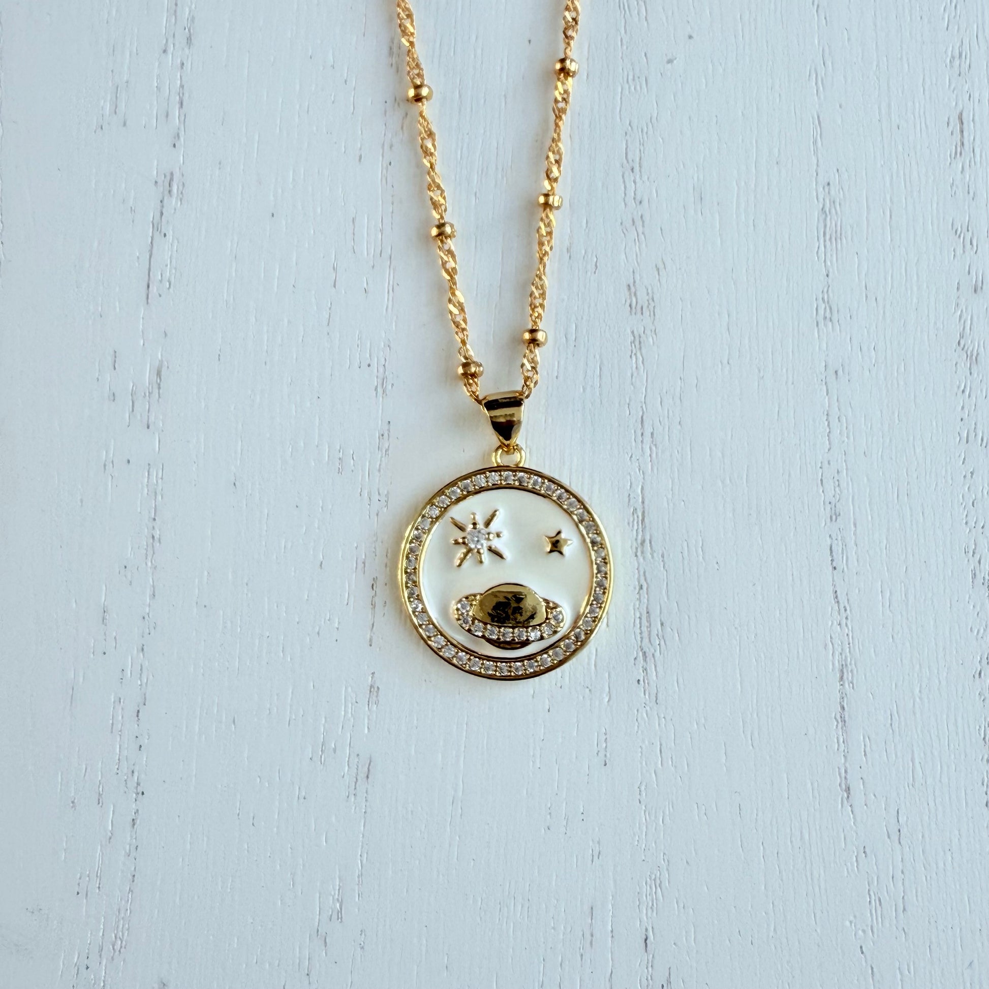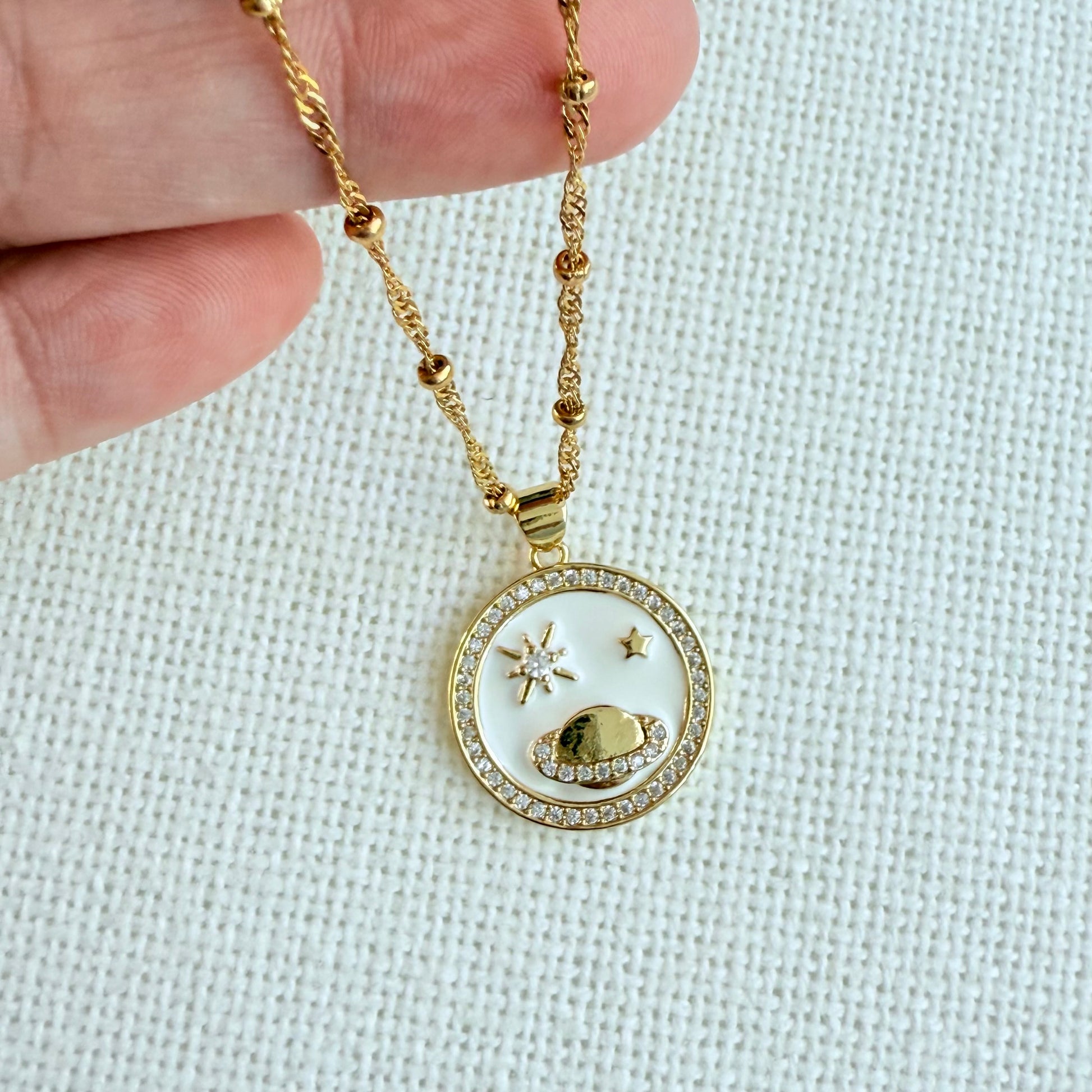 A dreamy and modern piece inspired by the beauty of the cosmos. This delicate necklace features a planet-like pendant that adds a subtle celestial touch to your everyday look. Made with 14K gold filled for durability and long-lasting shine — perfect for stargazers, dreamers, and lovers of unique details.