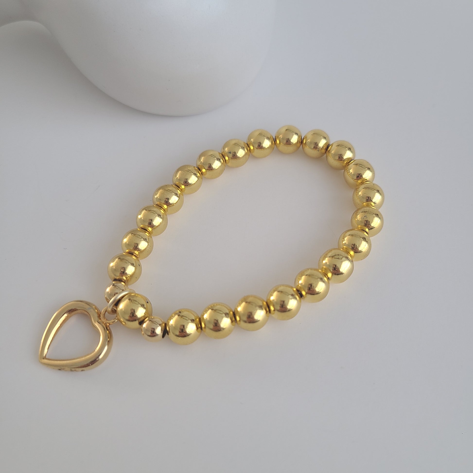 This beautiful and delicate bracelet is handcrafted with 8mm gold hematite gemstones The bracelet features a beautiful 24K gold plated heart charm.
