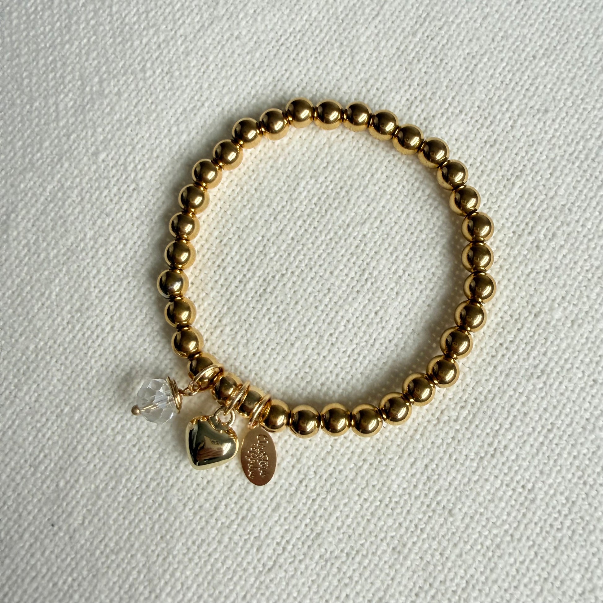 A delicate handmade bracelet crafted with gold-tone rhodium beads, featuring a charming heart charm and a beautiful Murano glass accent. The combination of textures and subtle colors creates a refined and elegant look with a unique artistic touch.