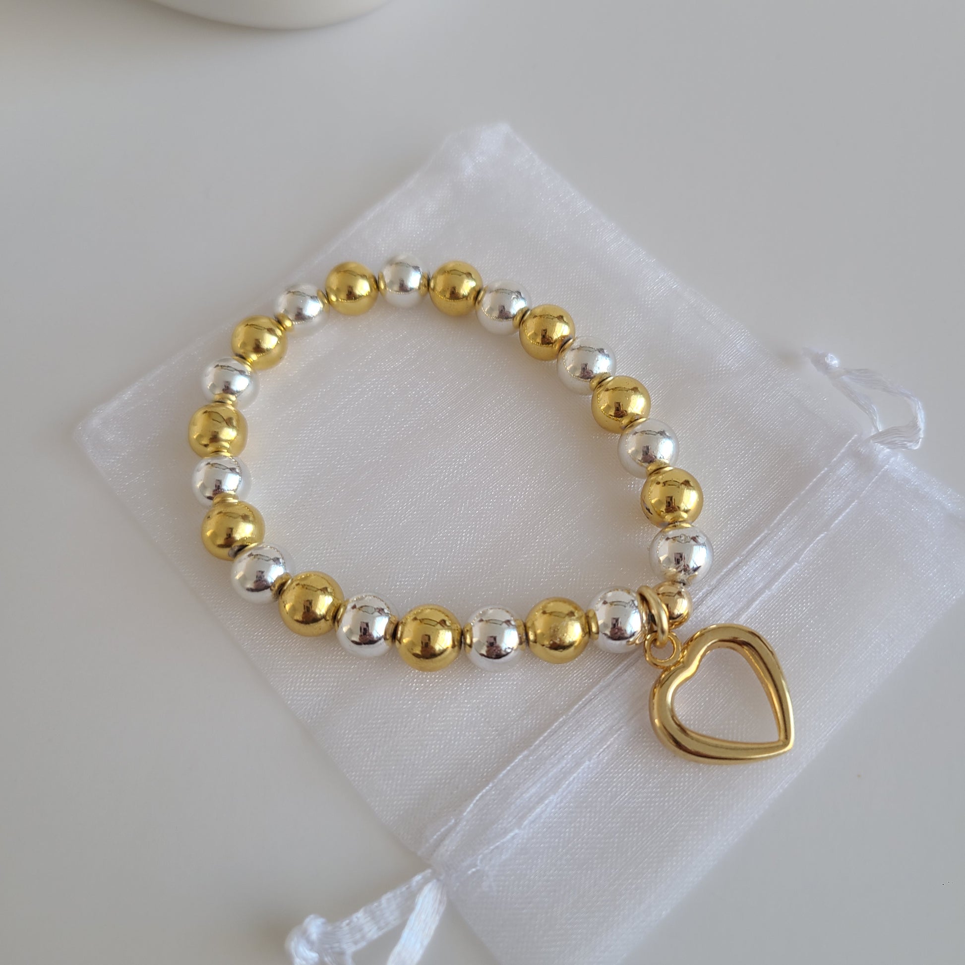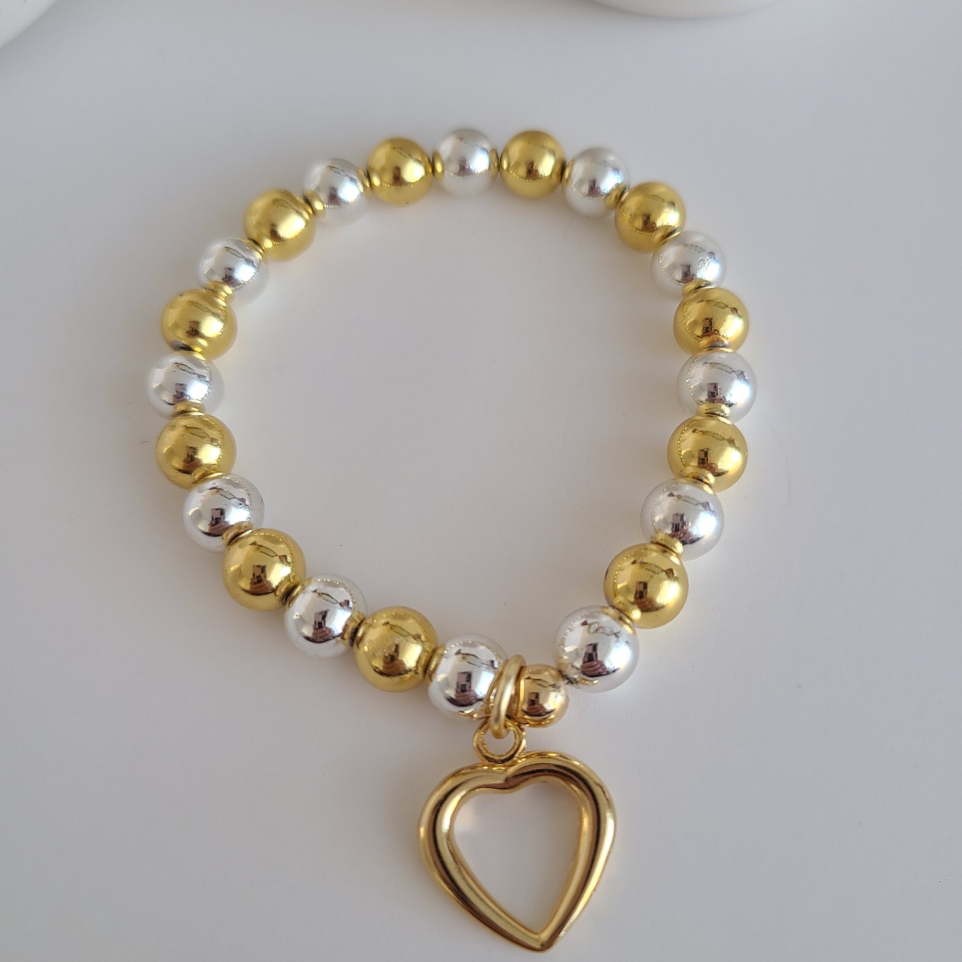 This beautiful and delicate bracelet is handcrafted with 8mm silver & gold natural hematite gemstones . The bracelet features a beautiful 24K gold plated heart charm.