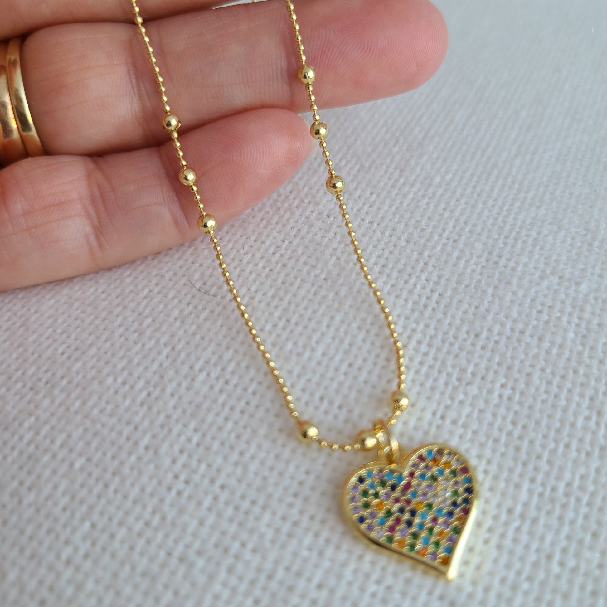 This beautiful necklace features a 14K gold-filled chain and a delicate heart pendant adorned with tiny, colorful crystals.
