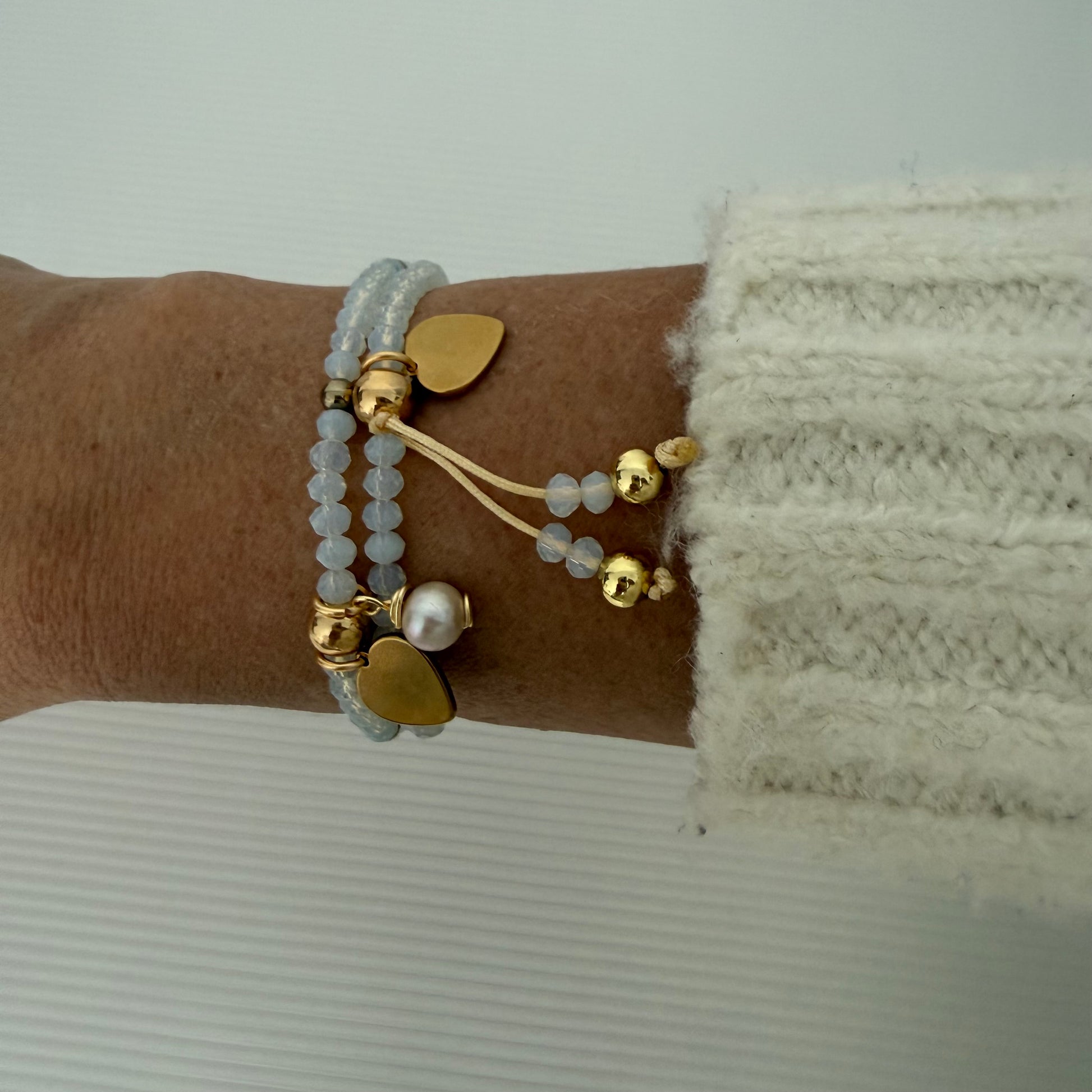 A set of double bracelets designed to be shared with someone special. Handmade with Murano glass beads, each set includes two bracelets in the same color and with the same charm, featuring subtle differences in their details. A delicate symbol of connection, friendship, and affection — created to celebrate the meaningful bonds in our lives.