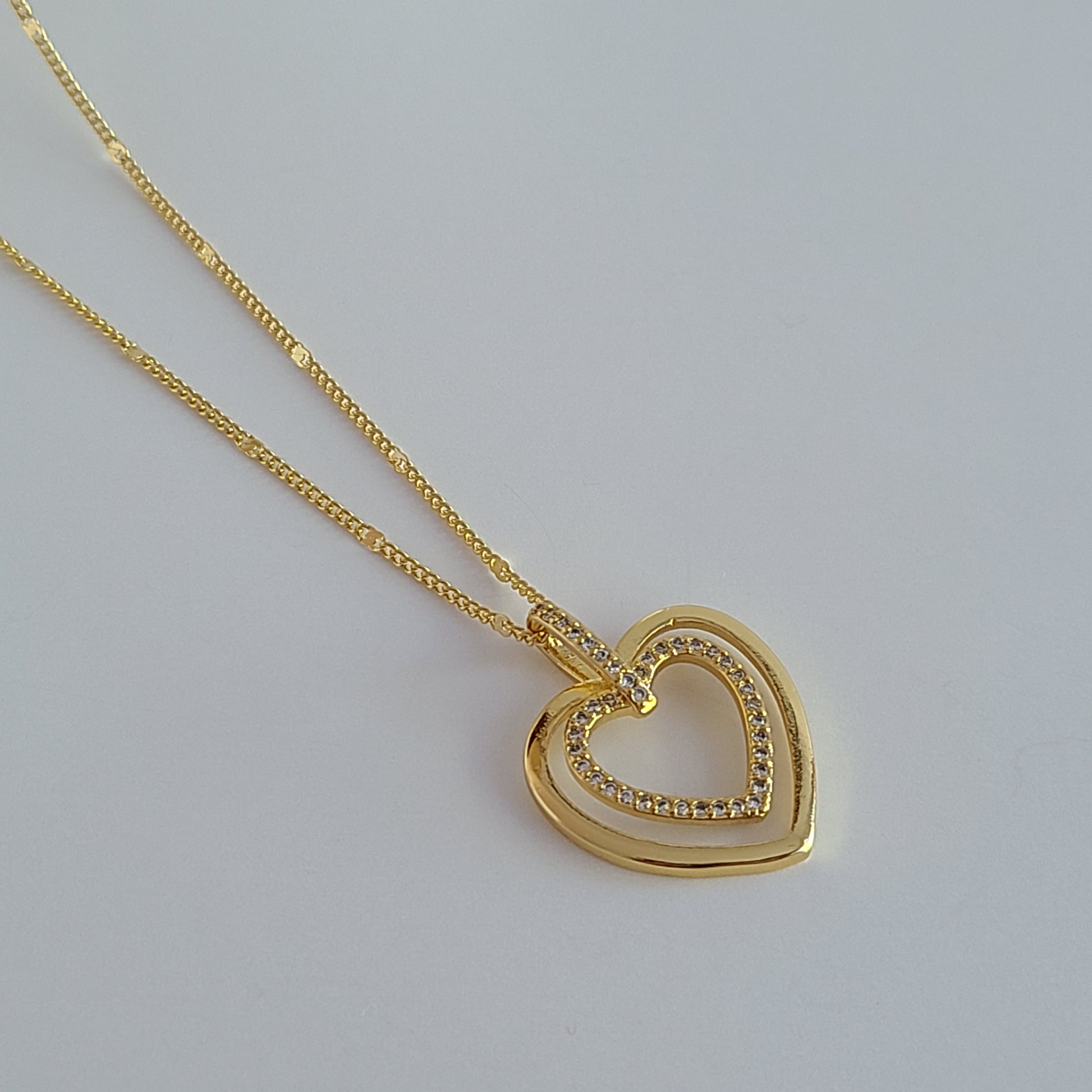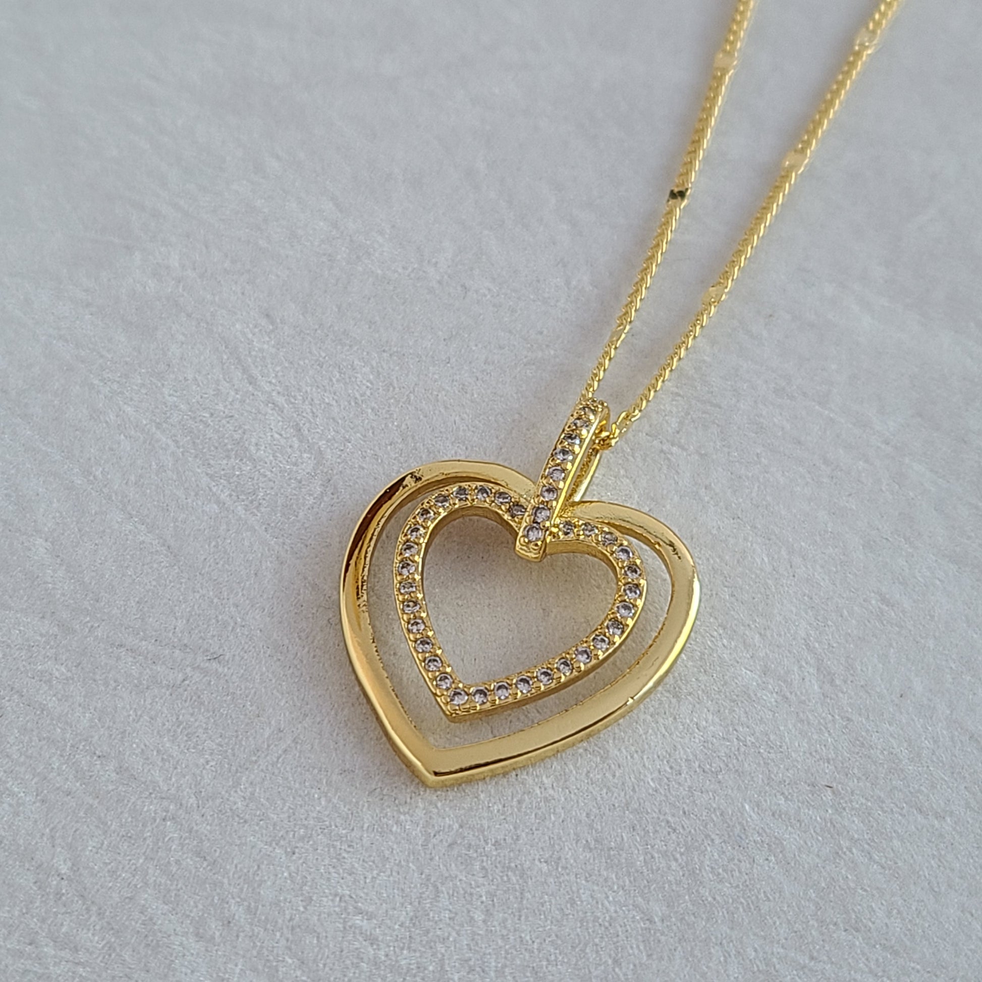 This lovely necklace features a 14K gold-filled chain adorned with a delicate heart charm embellished with tiny sparkling crystals.