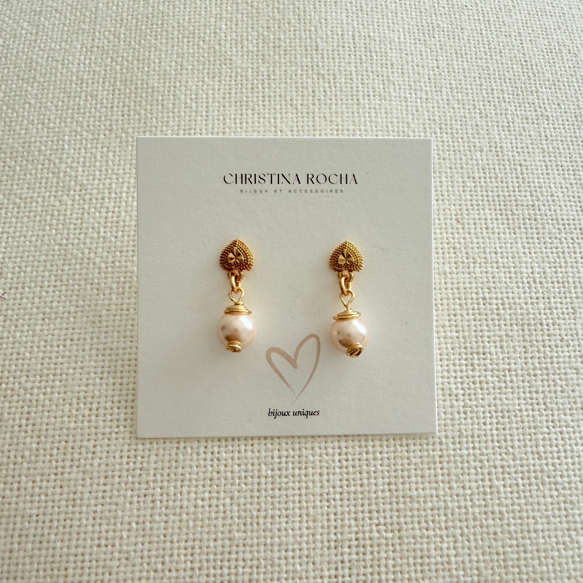 Handmade 24K gold-plated earrings featuring a charming mini heart base with delicate pearl drops. Feminine, romantic, and refined, this piece combines the timeless elegance of pearls with a sweet heart-shaped accent.