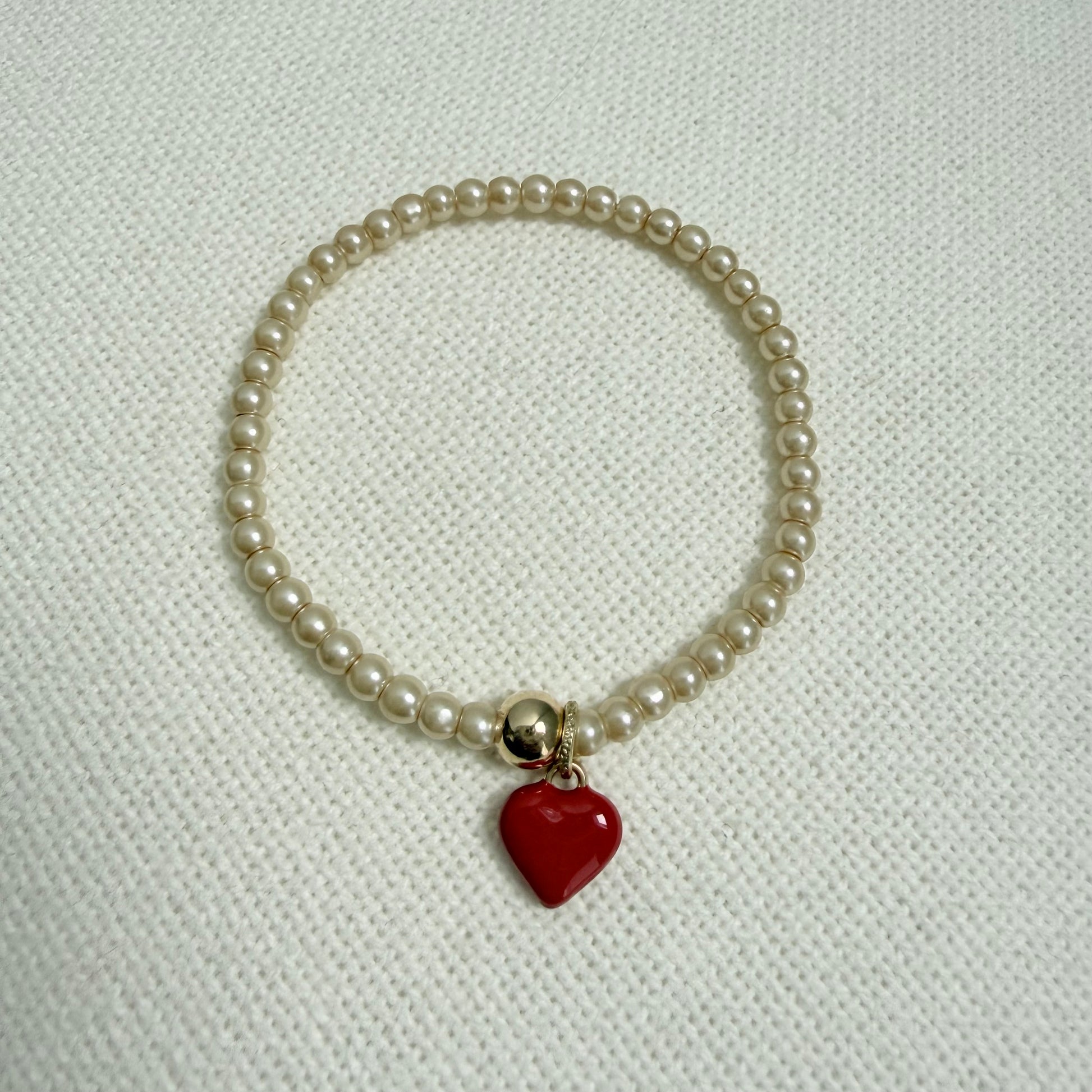 A romantic handmade bracelet crafted with 4 mm mini pearls, adorned with a delicate red heart charm symbolizing love and tenderness.