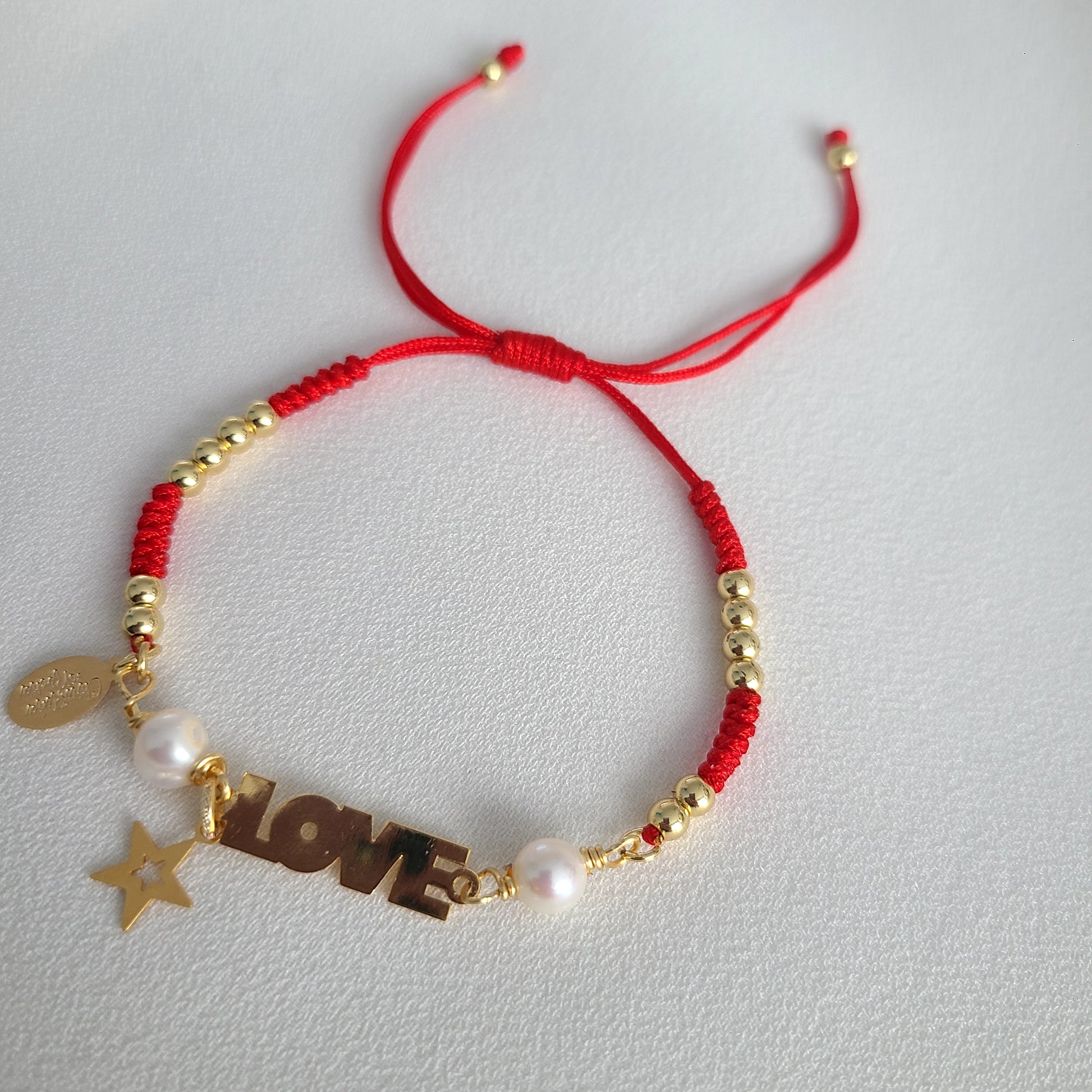 An adjustable, one-of-a-kind bracelet handcrafted with freshwater pearls, a delicate "Love" charm, a tiny star, and 14K gold-filled beads. A sweet and meaningful piece that adds softness, sparkle, and intention to any look.