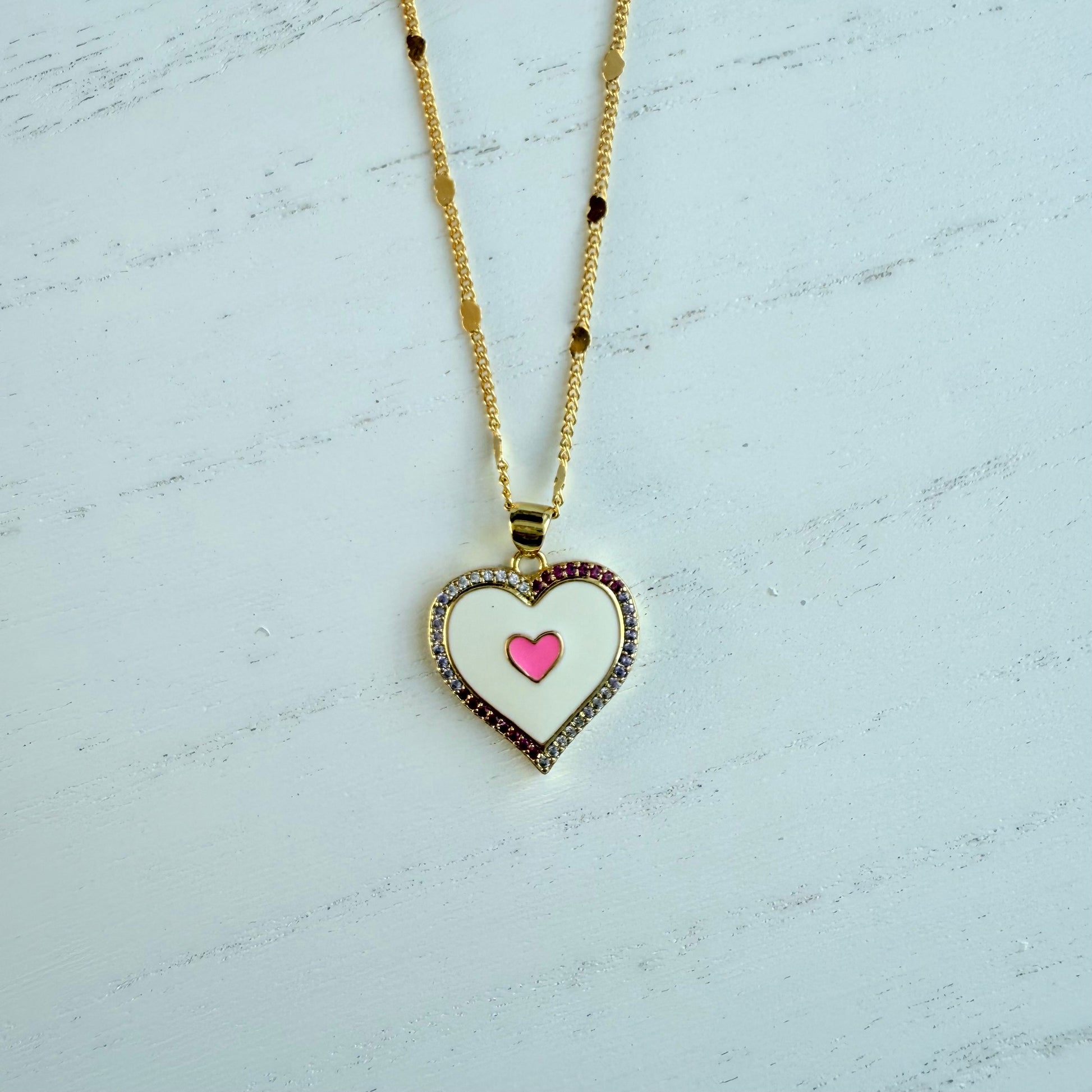 Delicate and feminine, this 14K gold filled necklace features a solid white heart-shaped pendant, gracefully surrounded by tiny shimmering crystals. At its center, a small blush pink heart adds a soft, romantic detail that makes the piece feel truly special.