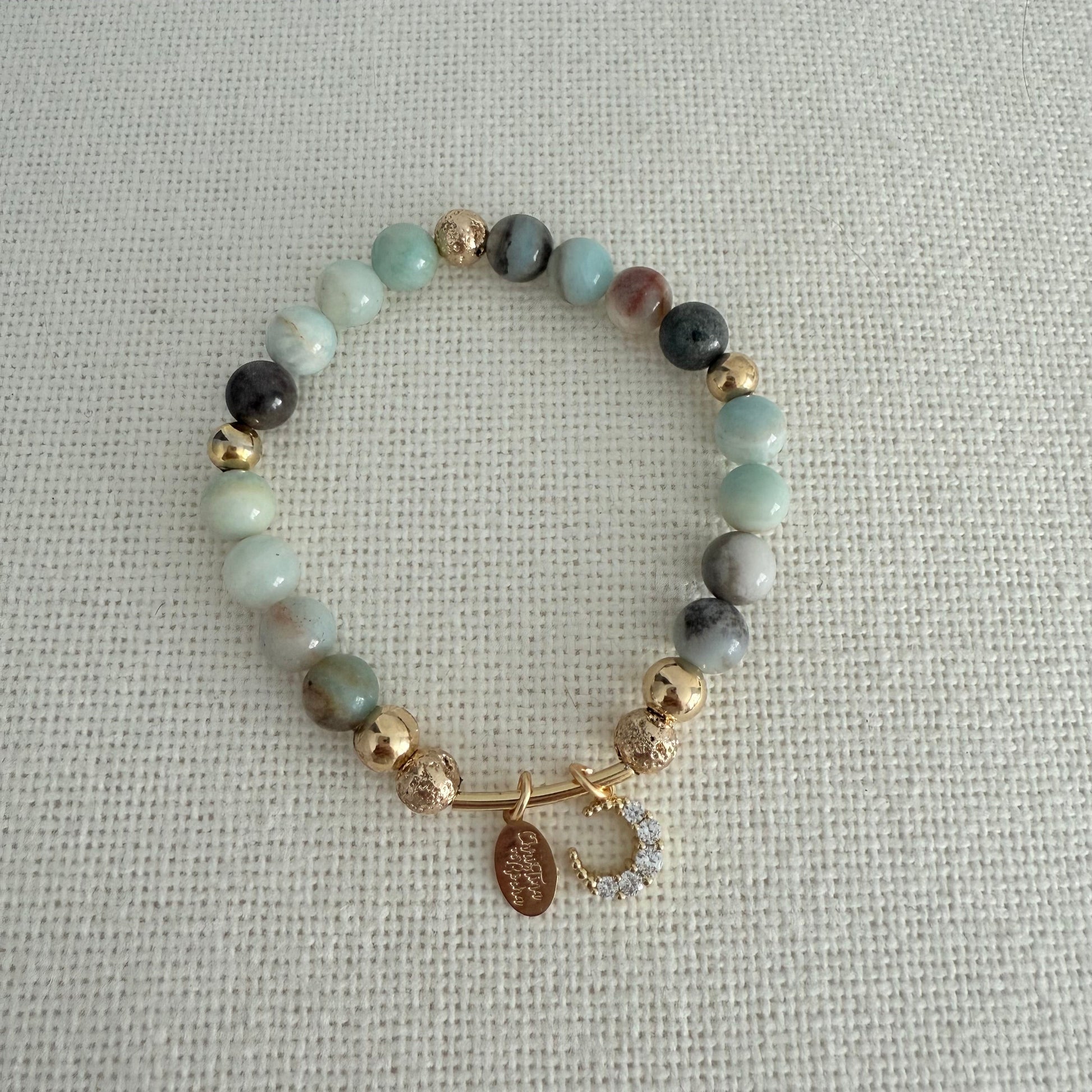 Handcrafted bracelet made with natural amazonite stones, admired for their soft hues and serene beauty. Delicate 14K gold filled details add a warm, refined glow, while the moon-shaped charm adorned with tiny crystals brings a subtle touch of magic and femininity.