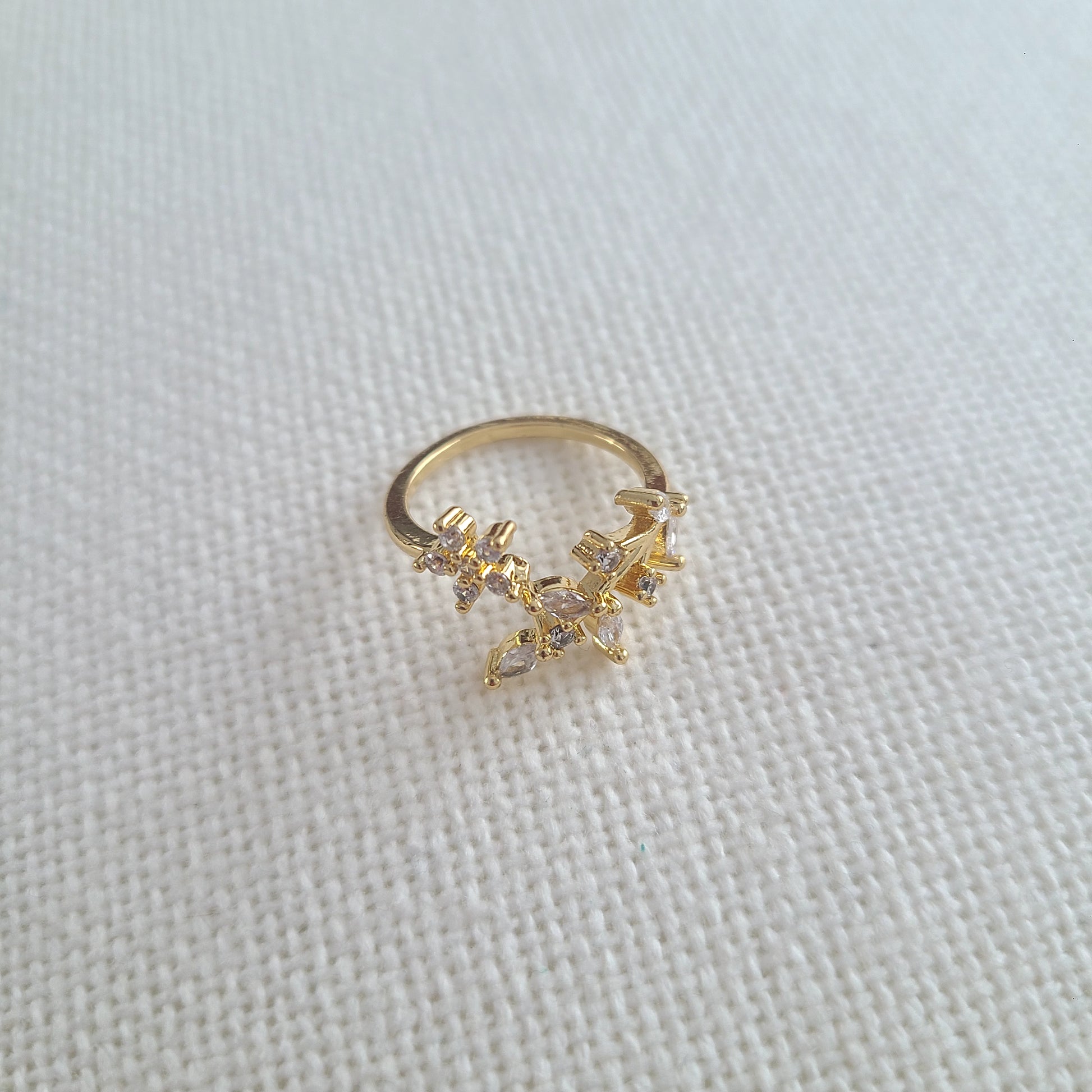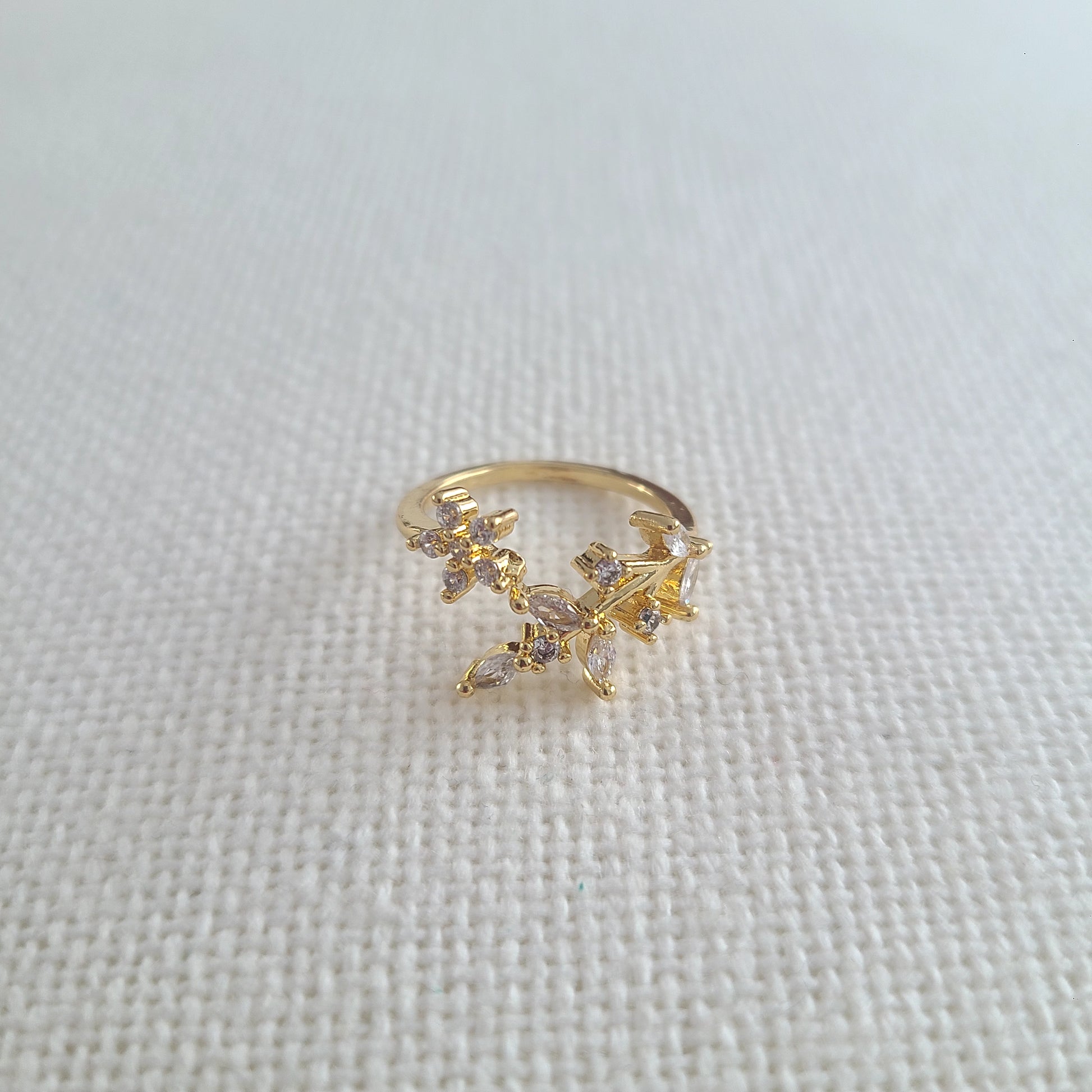 Elegant and nature-inspired, this adjustable gold rhodium ring features a delicate branch-like design adorned with sparkling mini crystals. A graceful, feminine piece, hypoallergenic and perfect for everyday shimmer.
